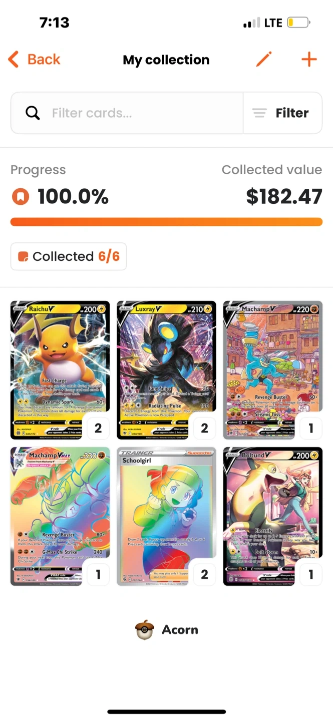 Selling a collection of Pokemon cards! Includes Raichu V, Luxray V, Machamp V, Schoolgirl Trainer card, and Boltund V. The collected value is $182.47.
