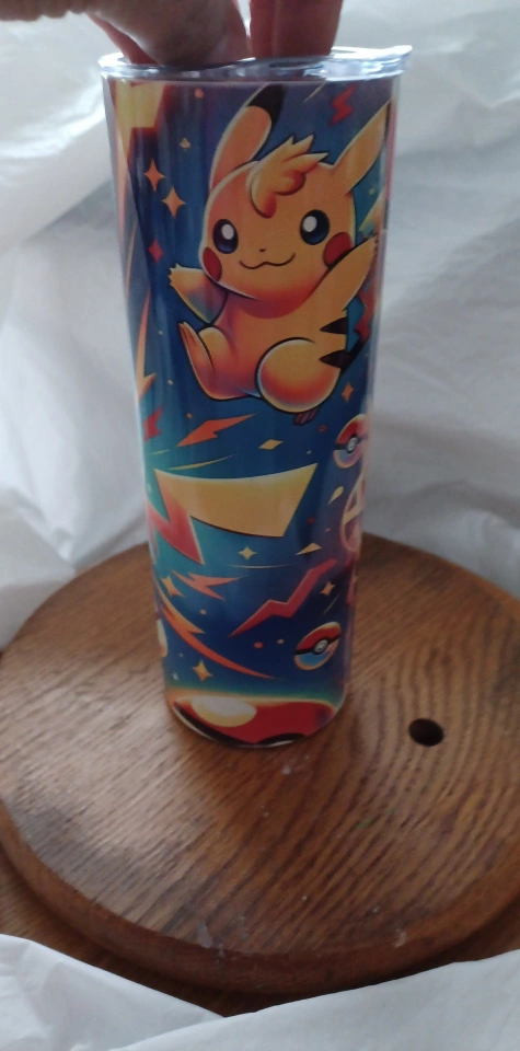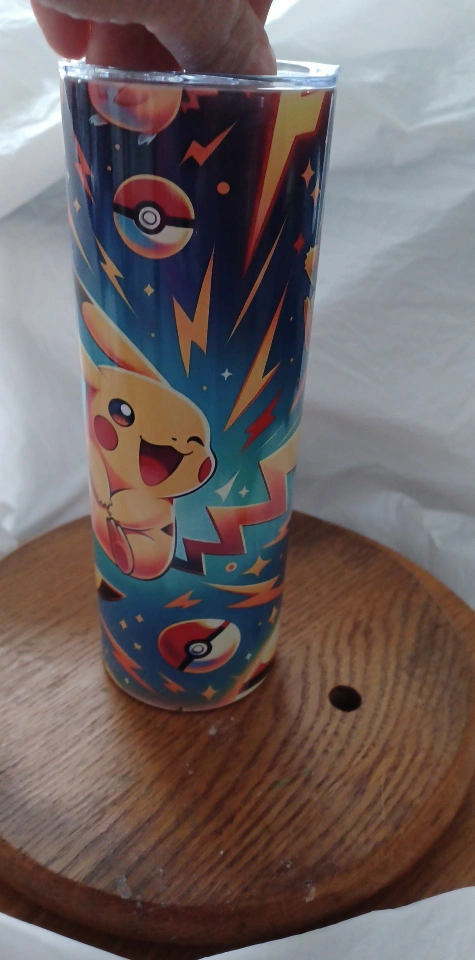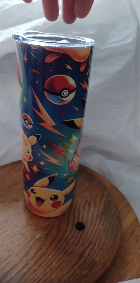 I made a Pokemon themed tumbler for sale! It features Pikachu and Pokeballs on a blue background. It's in great condition and ready for a new home