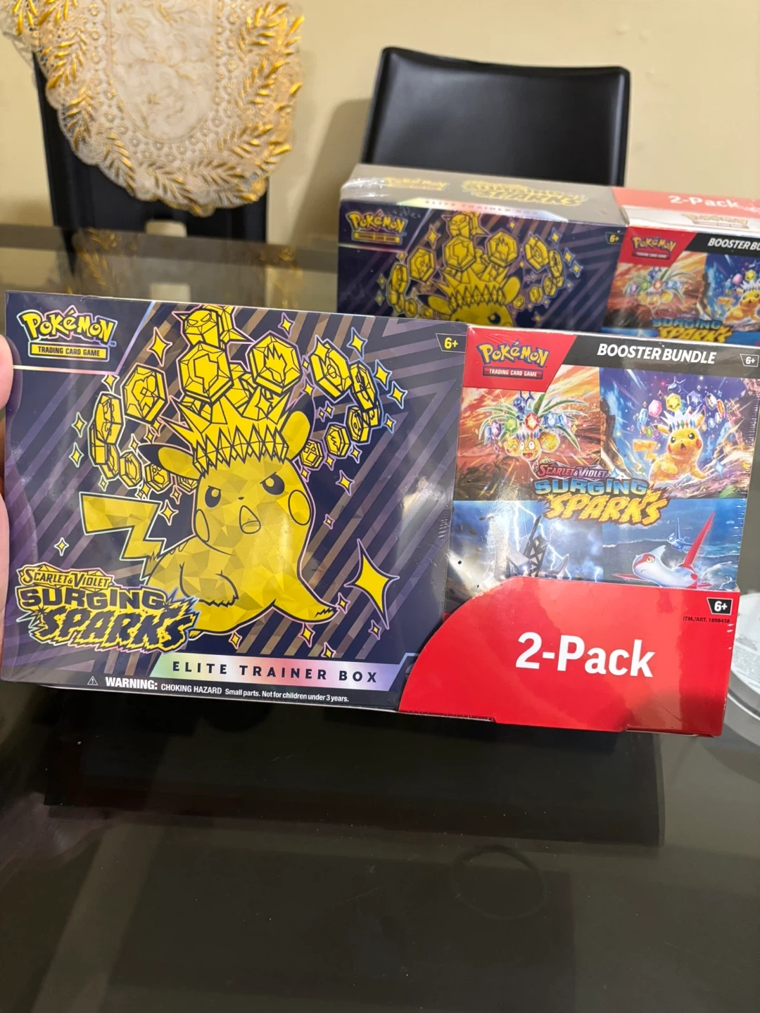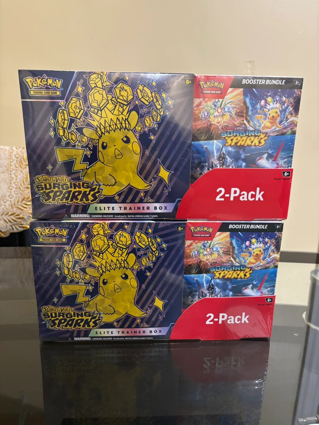 Selling a Pokemon TCG Scarlet & Violet Surging Sparks Elite Trainer Box and a Surging Sparks Booster Bundle! The Elite Trainer Box includes: - 9 Pokemon TCG Scarlet & Violet-Surging Sparks booster packs - 1 full-art foil promo card featuring Magneton - 65 card sleeves featuring illustration - 45 Pokemon TCG Energy cards - A player's guide to the Scarlet & Violet-Surging Sparks expansion - 6 damage-counter dice - 1 competition-legal coin-flip die - 2 plastic condition markers - A collector's box to hold everything, with 4 dividers to keep it organized - A code card for Pokemon Trading Card Game Live