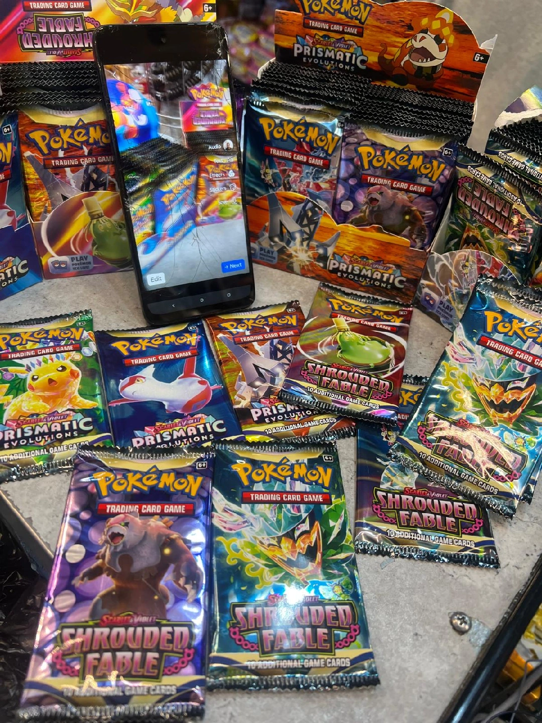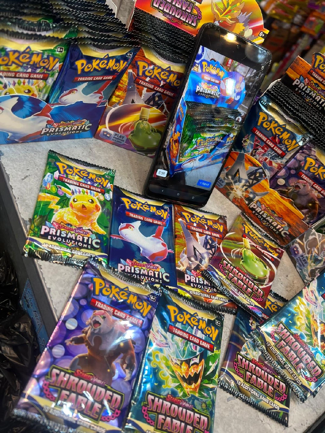 Selling various Pokemon Trading Card Game booster packs. Packs include Prismatic Evolution and Shrouded Fable. Each pack contains 10 additional game cards