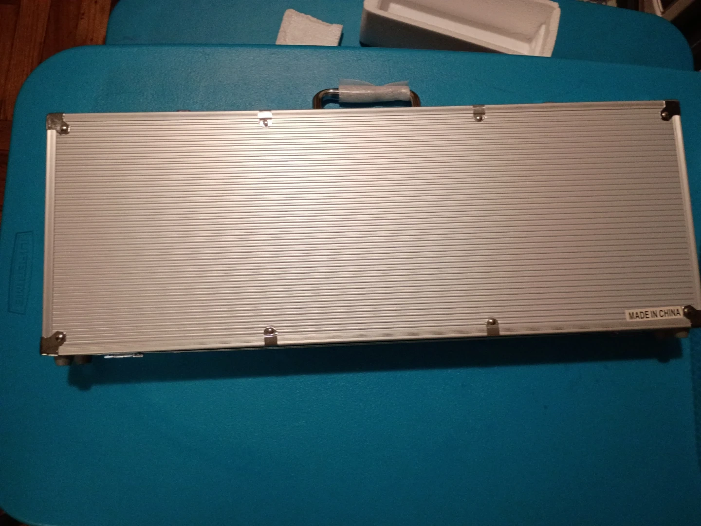10Selling a complete poker chip set housed in a sturdy aluminum case! This set includes a variety of colored chips, playing cards, and dice, perfect for your next poker night. The set also includes dealer, big blind, and small blind markers. Everything is neatly organized within the case for easy storage and transport