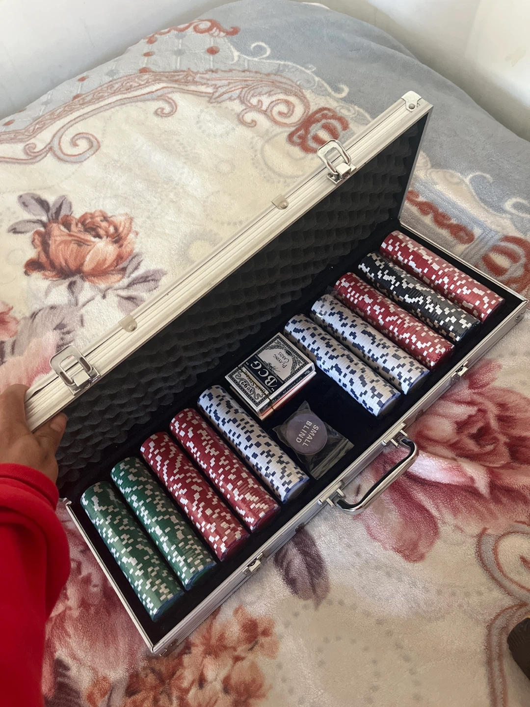 15Selling a complete poker set, including a variety of chips, cards, and a small blind marker. It comes in a sturdy carrying case, perfect for storage and transport. The cards are included, so you're ready to play right away!