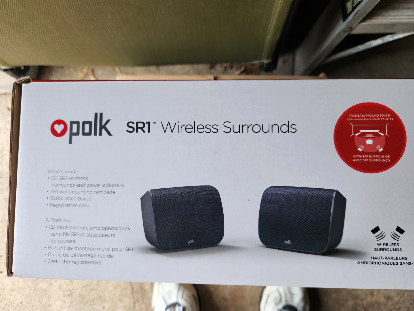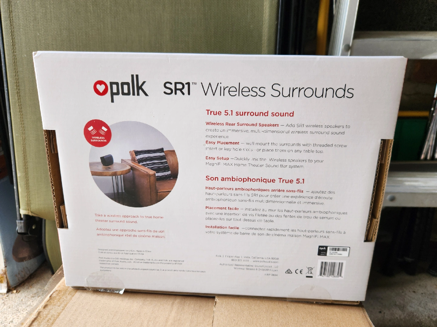 Selling a pair of Polk SR1 Wireless Surround Speakers in excellent condition! These speakers are designed to easily connect to your MagniFi MAX or MAX SR soundbar system for a true 5.1 surround sound experience. They can be wall-mounted or placed on any tabletop. Included in the box are the SR1 Wireless Surrounds, power adapters, wall mounting template, quick start guide, and registration card