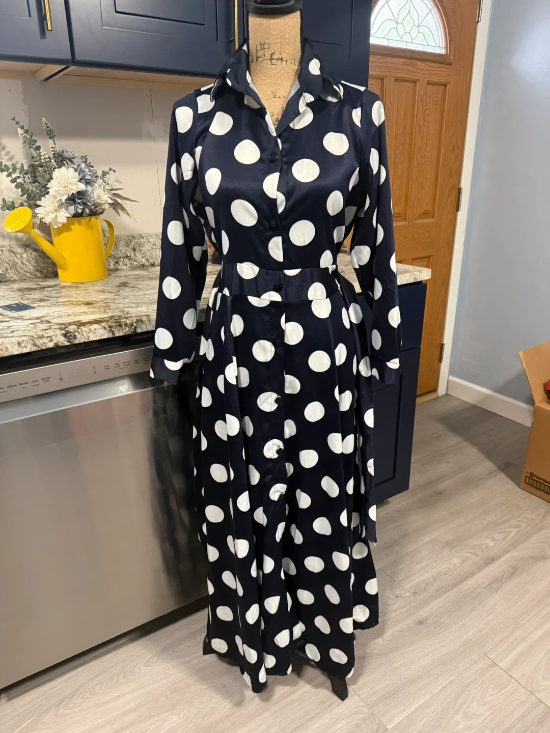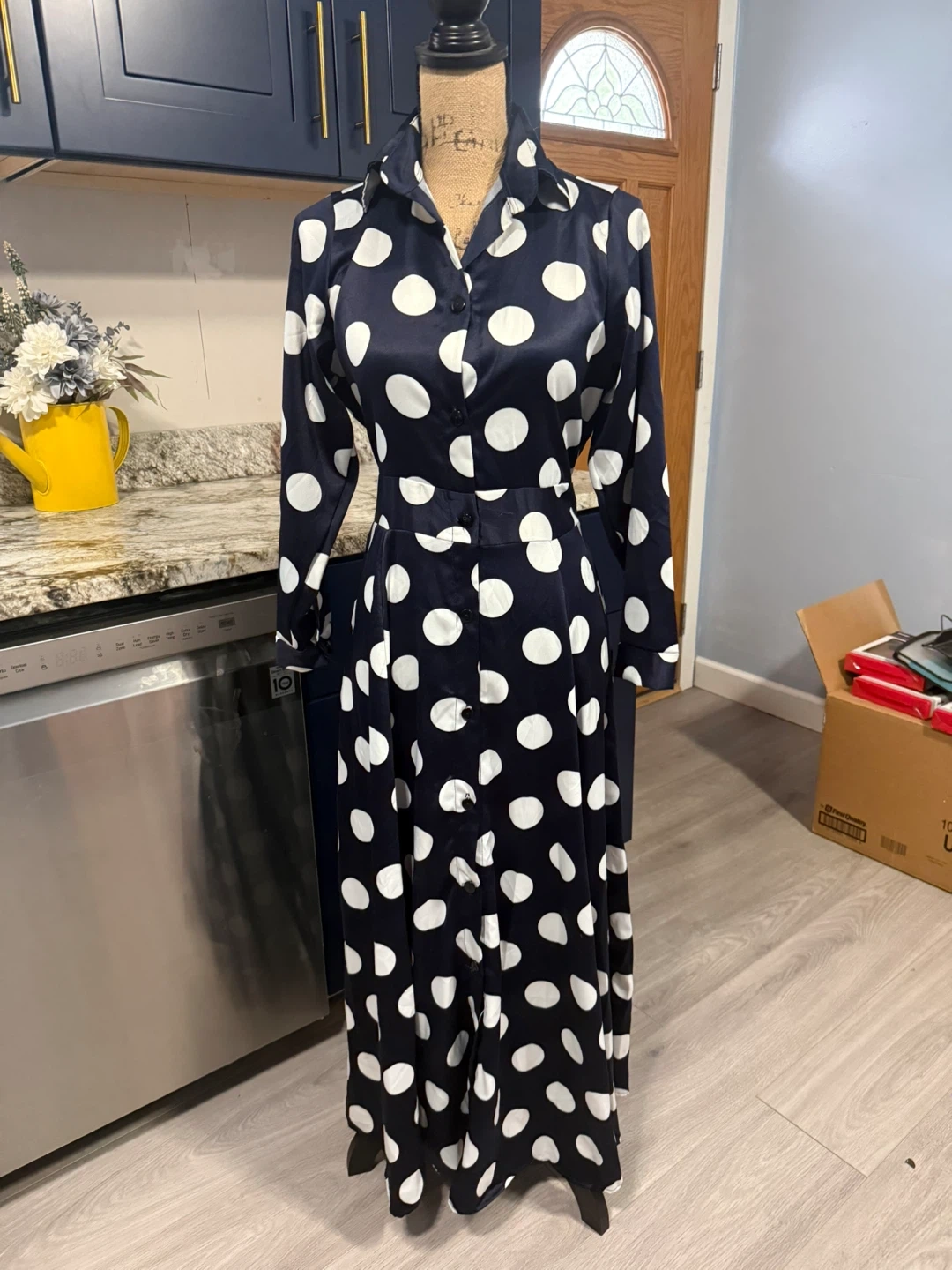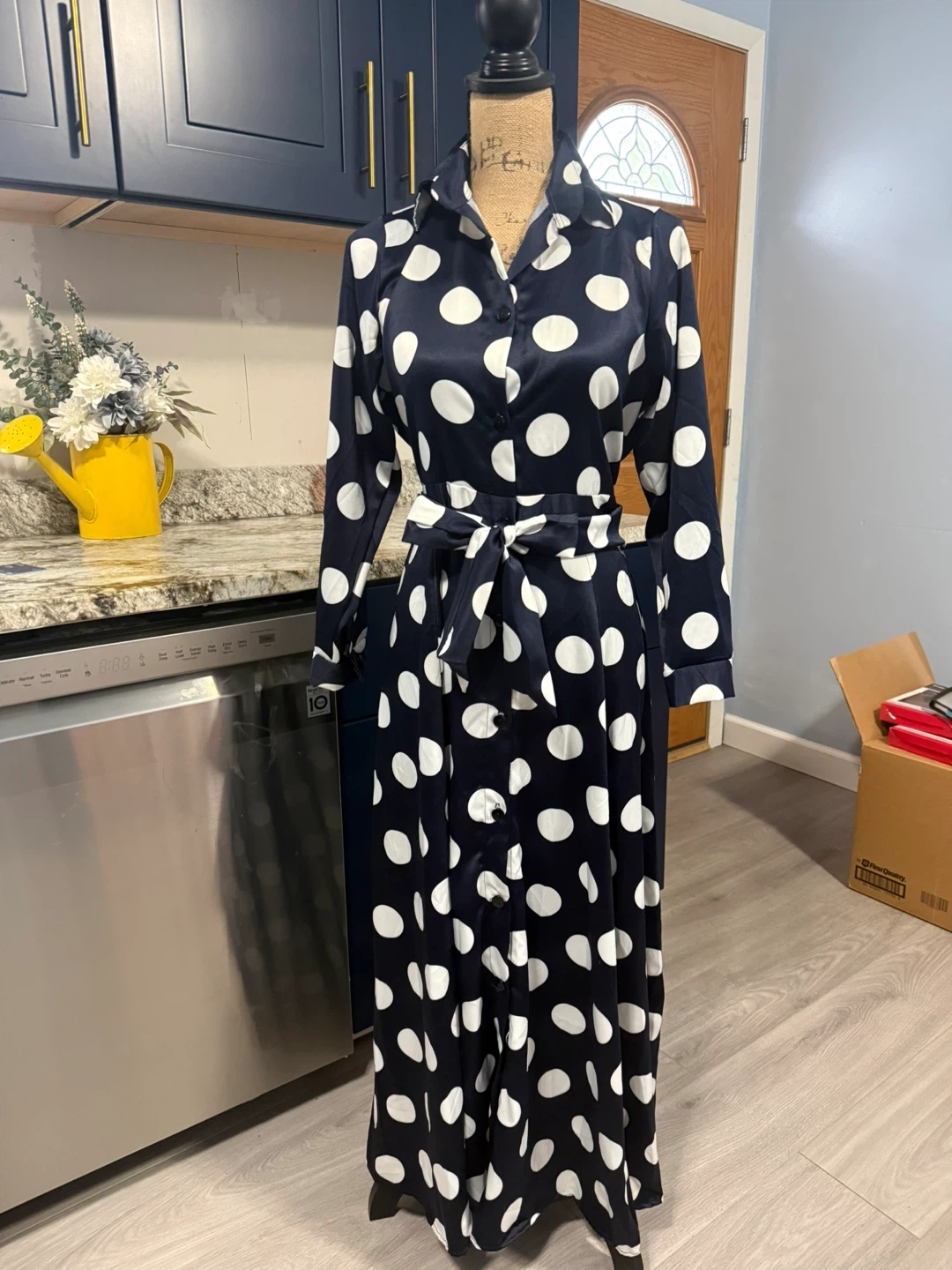 Like new ues 2 time only very clean condition Elegant navy blue maxi dress with a white polka dot pattern. It features a collared neckline, button-down front, and a matching belt to cinch the waist. Perfect for a stylish and comfortable look!