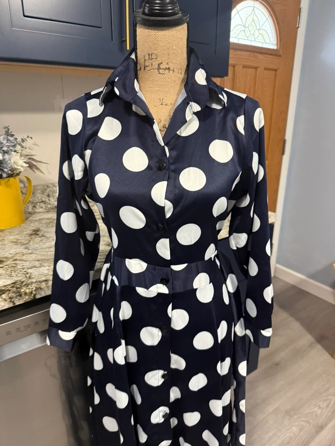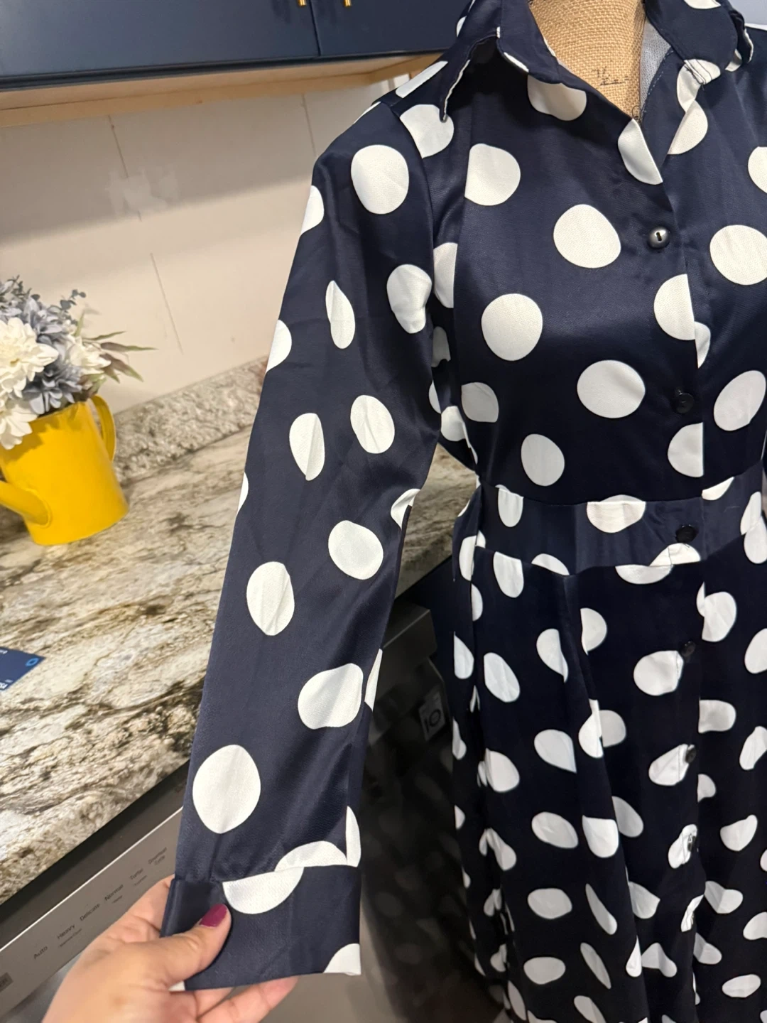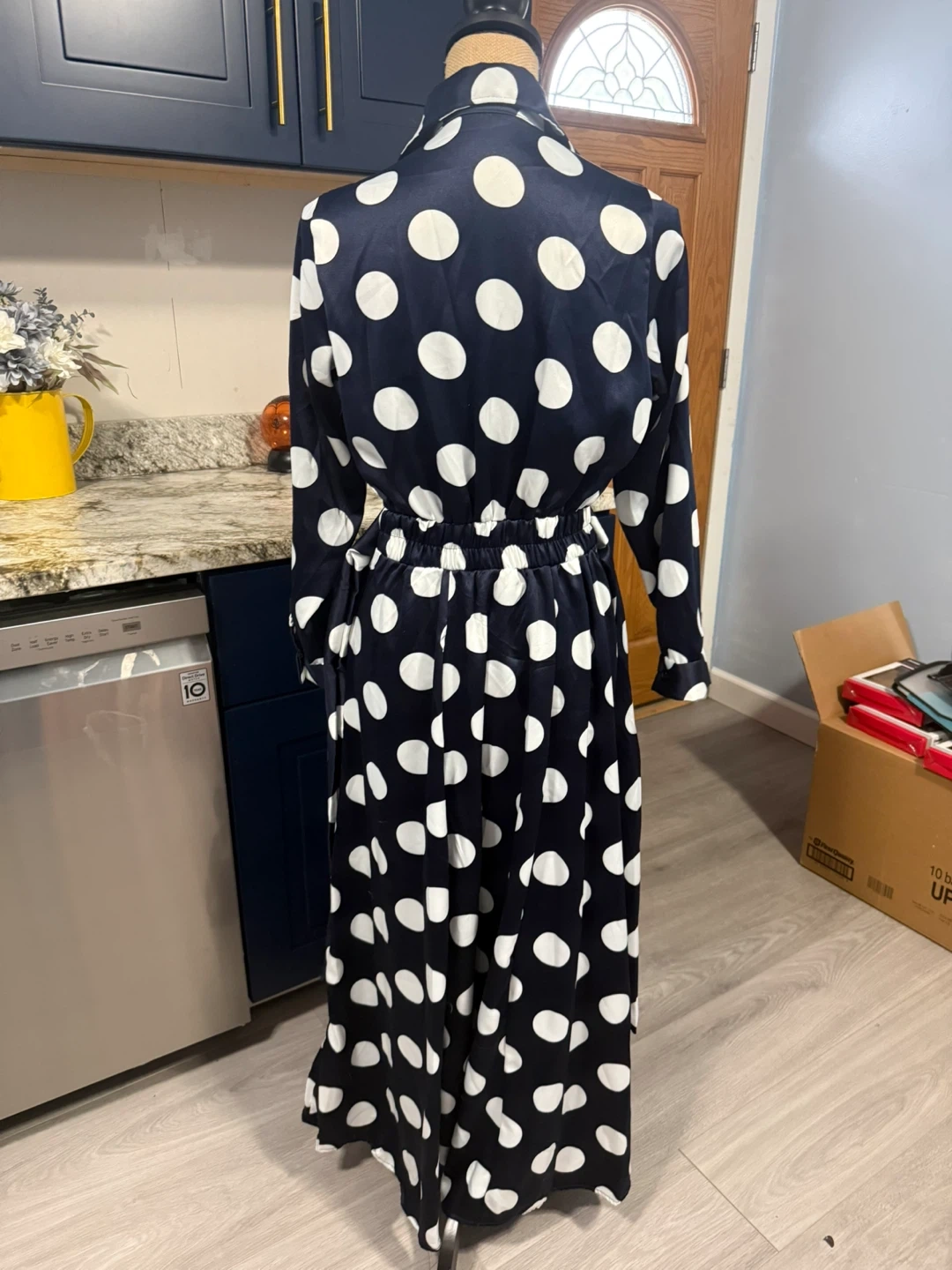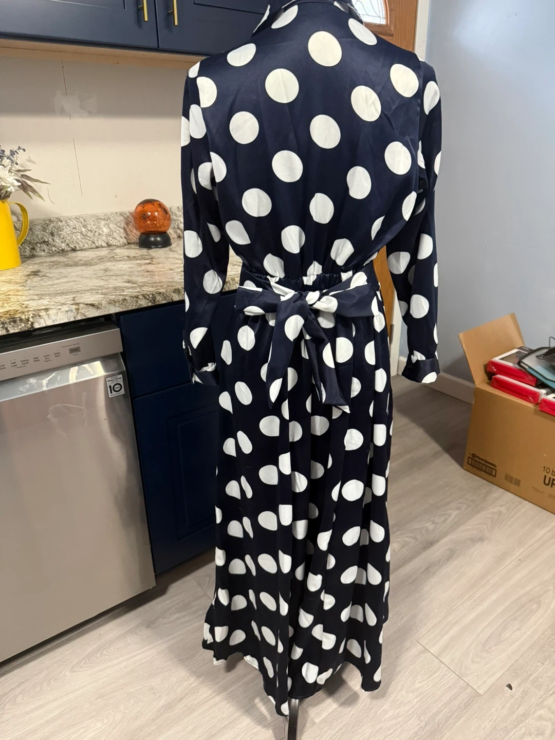 Like new ues 2 time only very clean condition Elegant navy blue maxi dress with a white polka dot pattern. It features a collared neckline, button-down front, and a matching belt to cinch the waist. Perfect for a stylish and comfortable look!