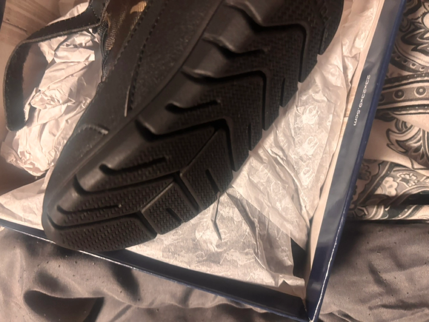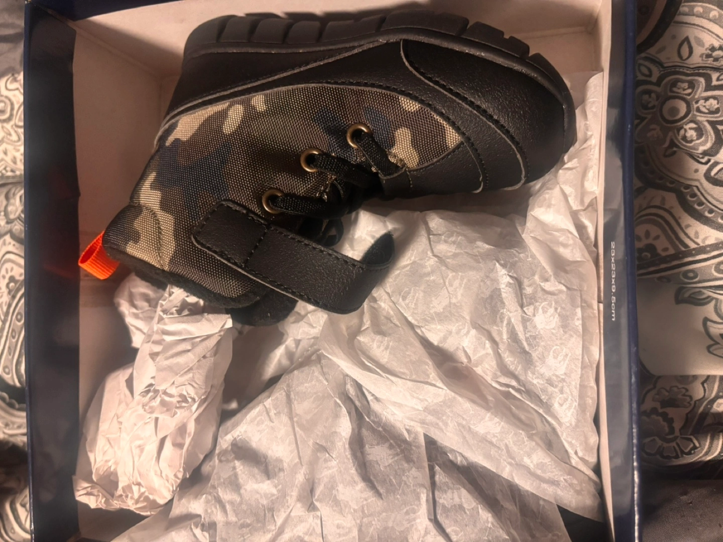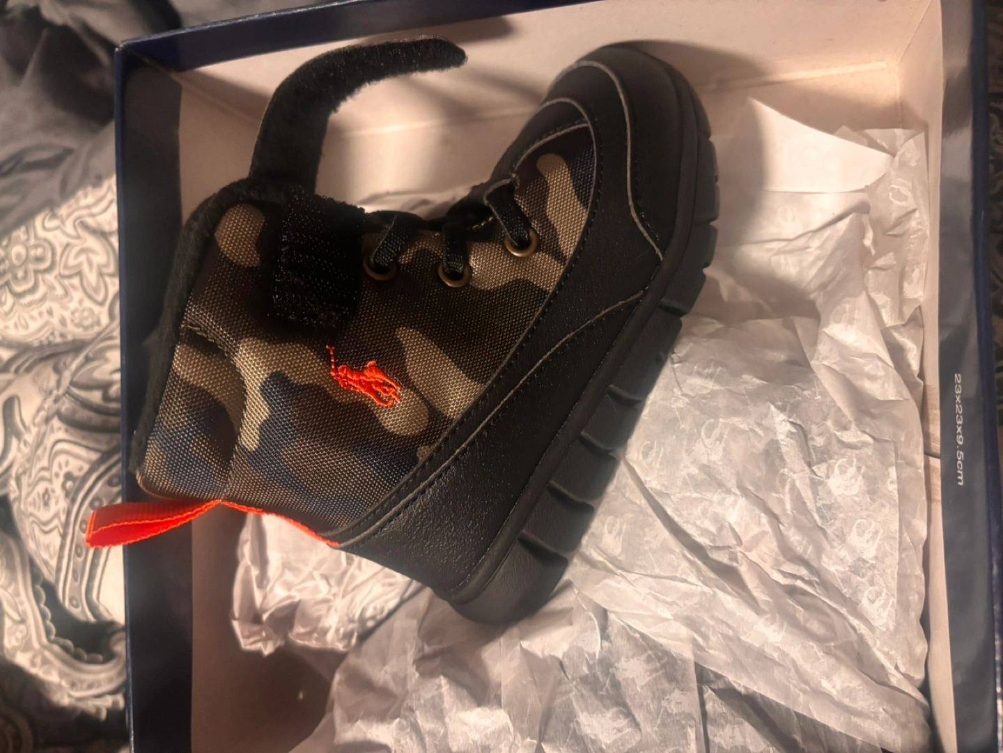 18Adorable baby boy boots. Camo print. Black accents. Orange pull tab. Great condition. Comes in original box.