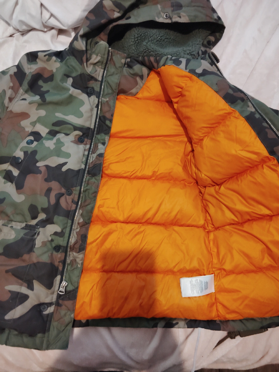 Selling a Polo Ralph Lauren puffer jacket with a camouflage pattern and a bright orange lining. It's in great condition and ready for a new owner! Perfect for staying warm and stylish.