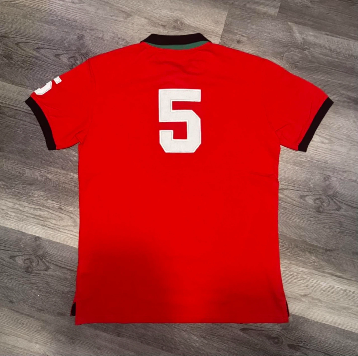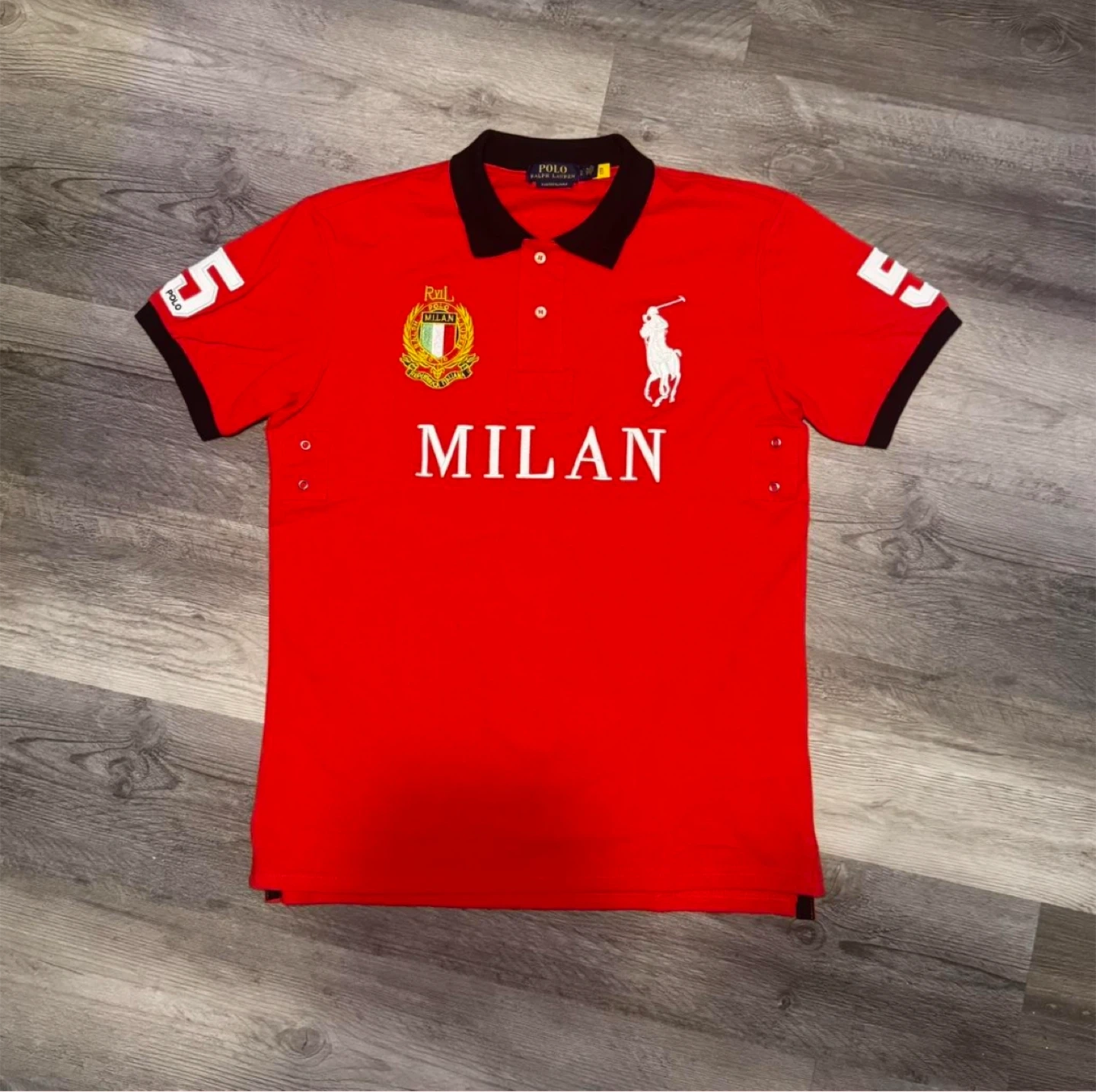 Selling a vibrant red Polo Ralph Lauren polo shirt with a Milan design. It features the number 5 on both the front and back, as well as the Polo Ralph Lauren logo. A stylish and eye-catching piece!