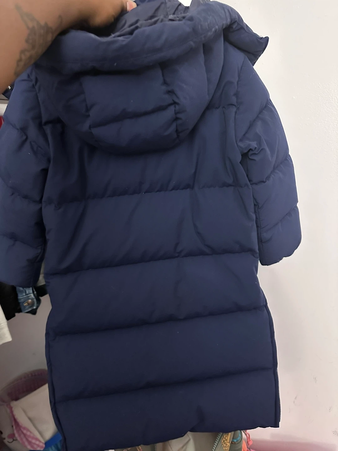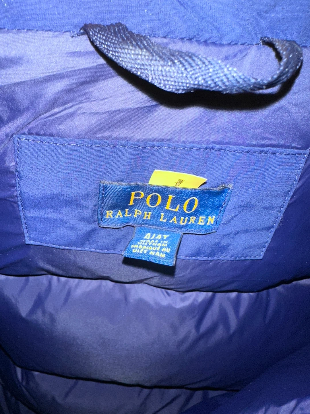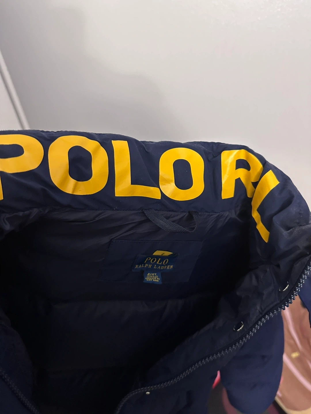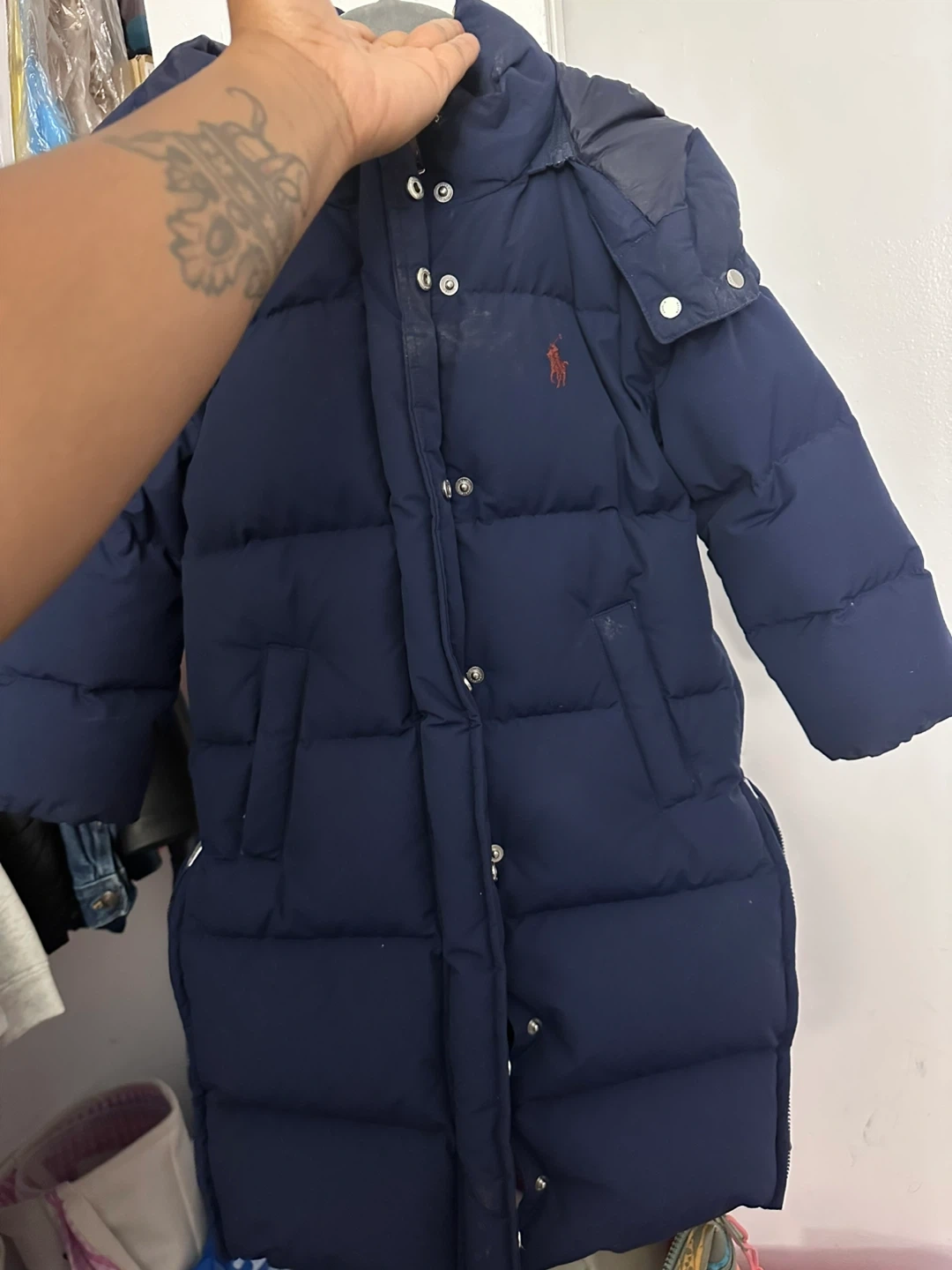 Selling a Polo Ralph Lauren puffer coat in navy blue. It's in good condition and perfect for keeping warm! The coat features a hood and a full zip closure.