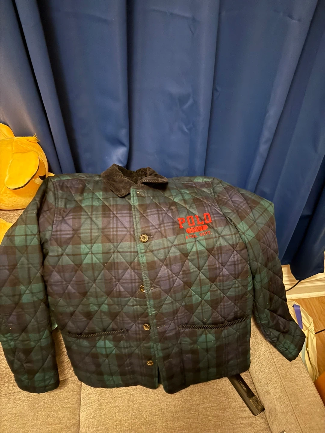 Selling a Polo Ralph Lauren quilted jacket. The jacket features a plaid pattern and the 'POLO 1967 ATHL DEPT.' logo on the back. It's in great condition and ready for a new home