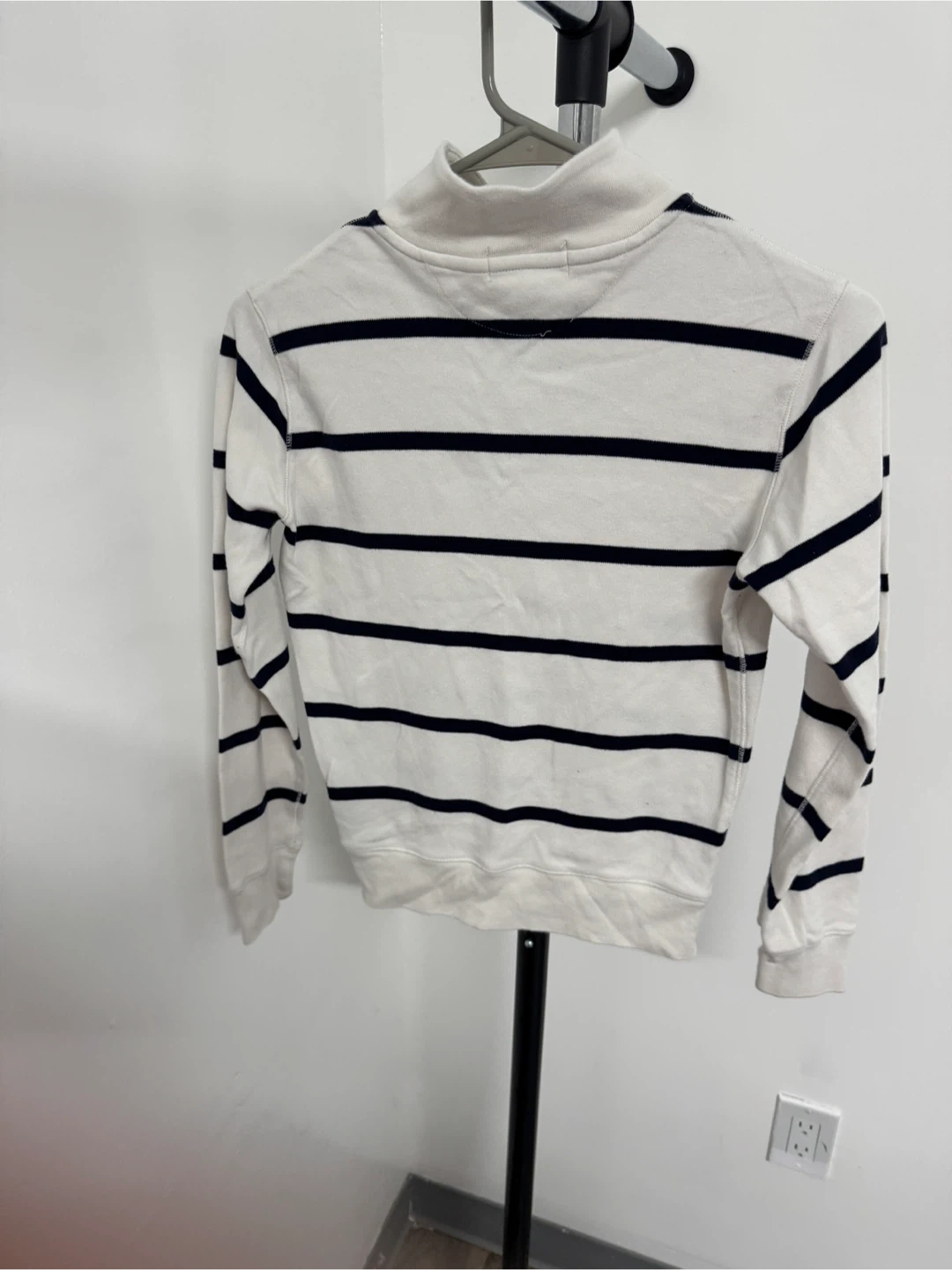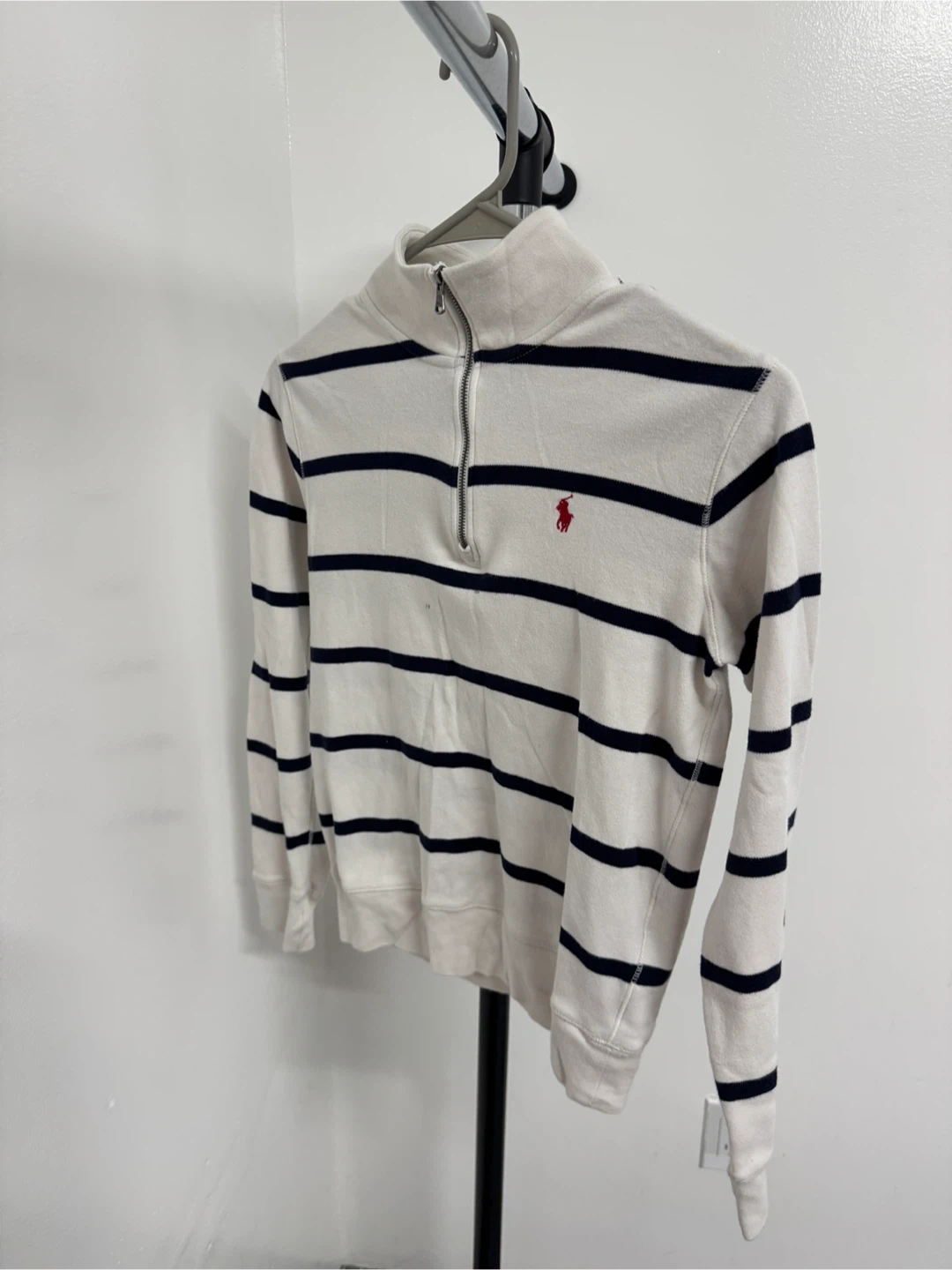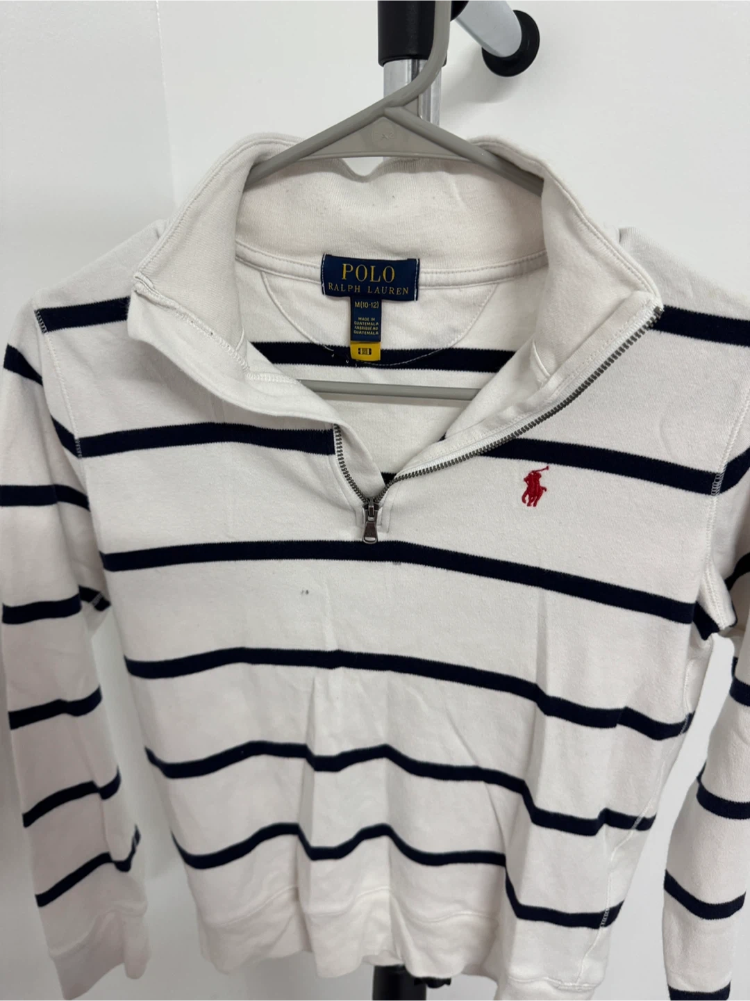 Selling a Polo Ralph Lauren pullover. It's a size M or a 10-12 in kids and features a white base with navy stripes. The classic Polo logo is embroidered in red on the chest. Great for layering or wearing on its own!