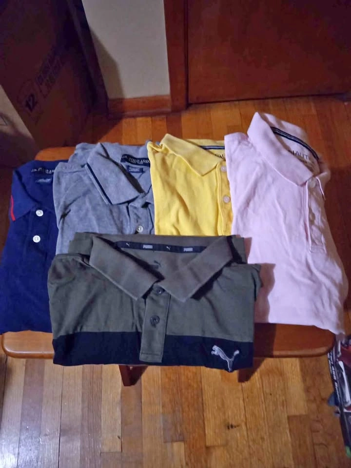 Both Nautica shirts are XL (kids' 18-20). The polo shirts are kids' sizes 14-16, and the Puma shirt is small. Let me know if you're interested!
