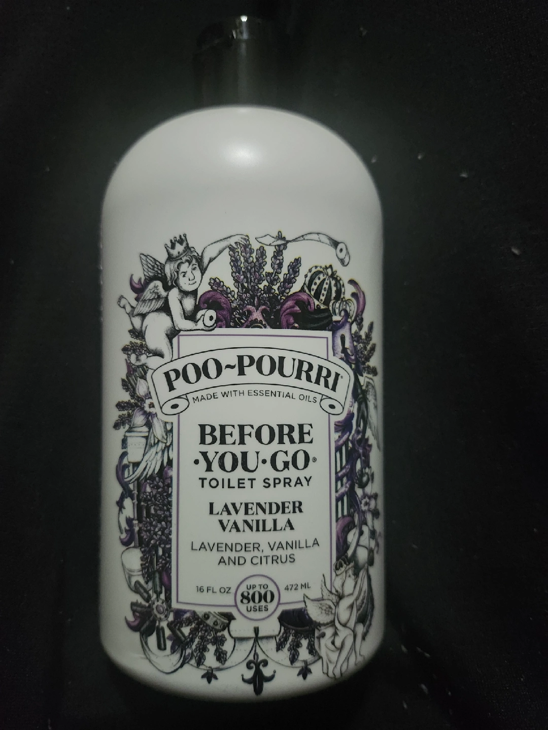 Selling a 16 fl oz bottle of Poo-Pourri Before You Go toilet spray in the Lavender Vanilla scent! It contains essential oils and can be used up to 800 times. Enjoy the blend of lavender, vanilla, and citrus to keep your bathroom smelling fresh