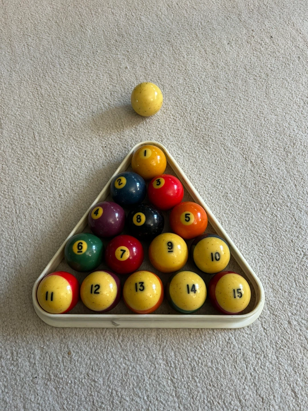 0Get ready for your next game night! Complete set of 16 pool balls (1–15 + cue ball) with a triangle rack included. All balls are solid, numbered clearly, and ready to play. Perfect for a home pool table, bar, or rec room. ✅ Full set — ready to use ✅ Includes triangle rack ✅ Standard 2¼” size ✅ Great for casual play or practice Used but in good working condition – some minor wear from use (see photos). 💬 Message me if interested — available for pickup in Chicago, flexible on price!