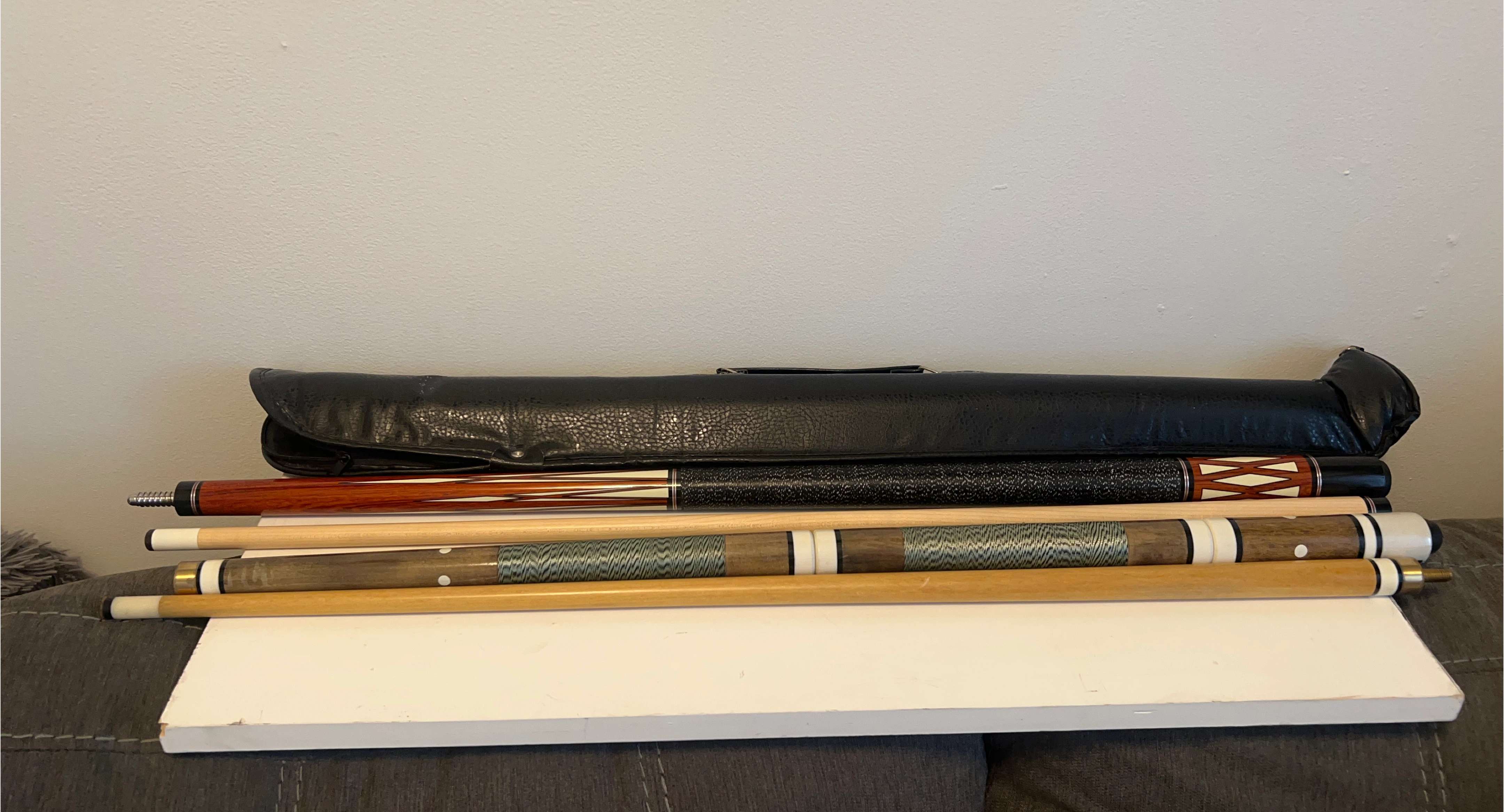 Selling a set of pool/billiard cue sticks, includes a carrying case. The set has different designs and wood finishes. Perfect for game night!