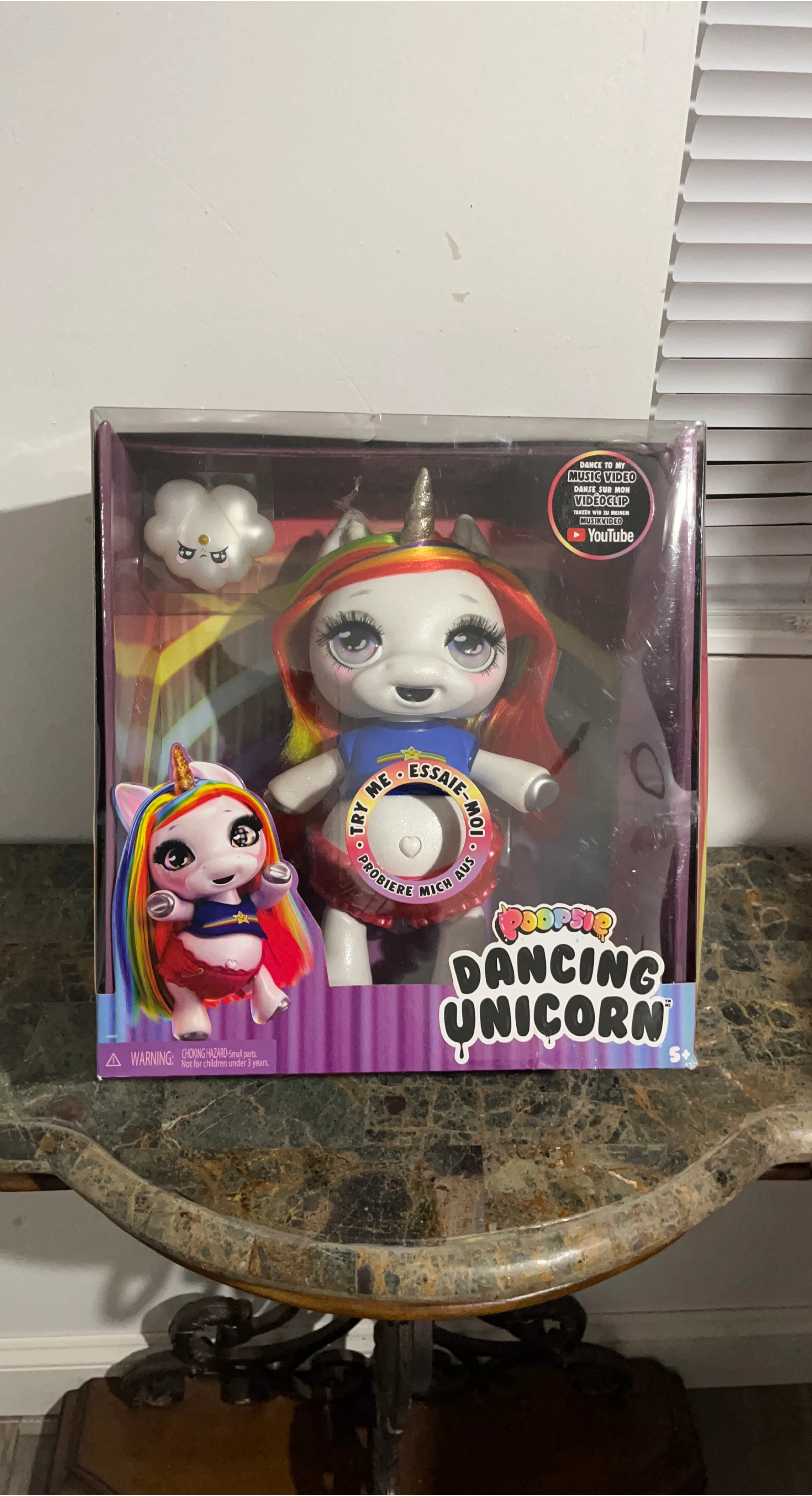 I am selling a Poopsie Dancing Unicorn doll, still in its original packaging! It's suitable for ages 5+. The box also shows that you can dance to the music video on YouTube