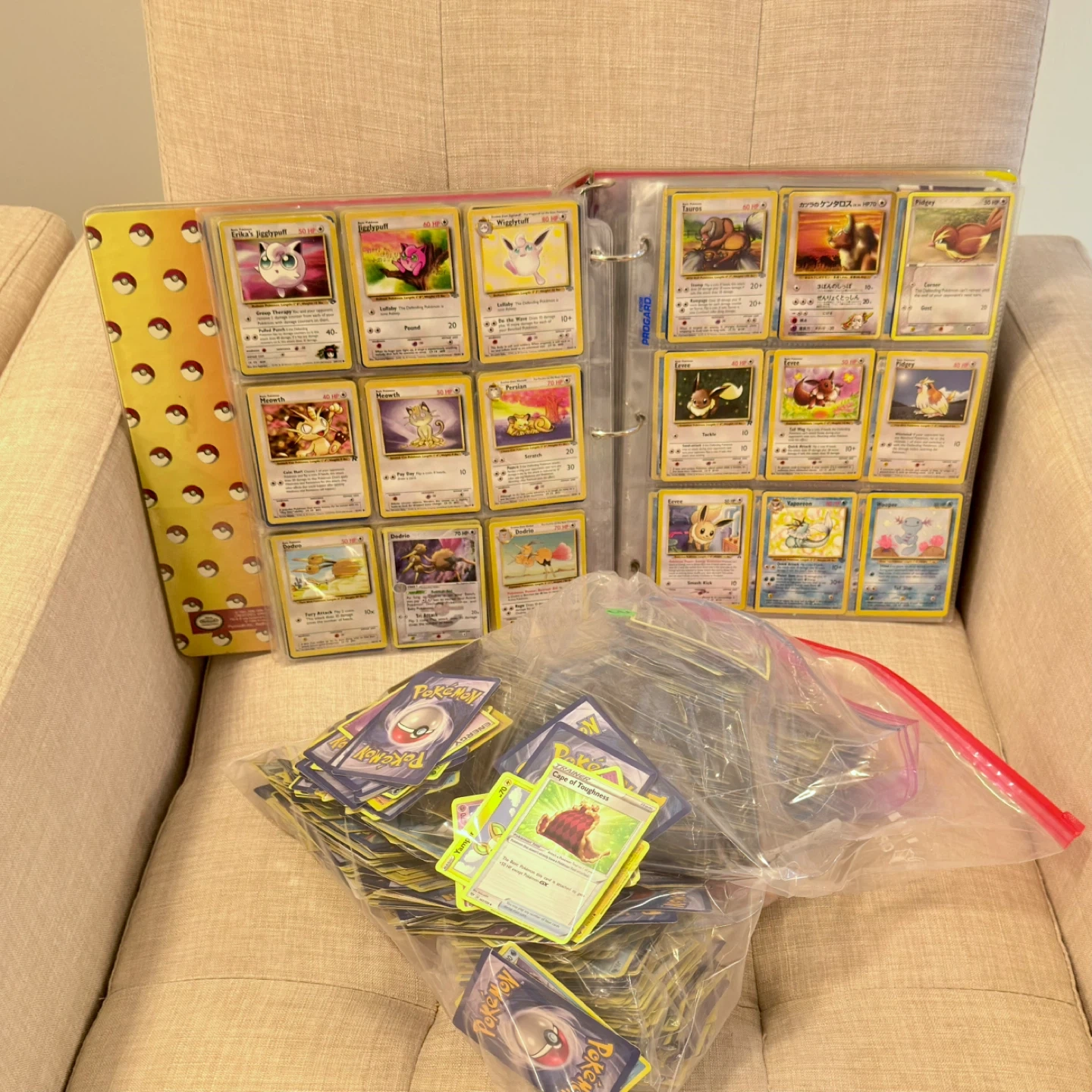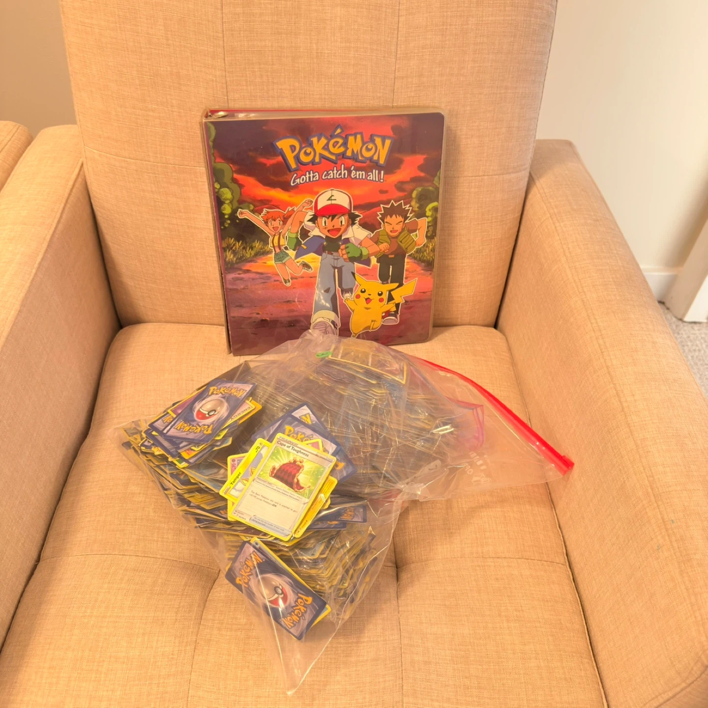 Selling a Pokémon card collection! It includes a binder filled with cards and a bag of loose cards. Great for any Pokémon fan!