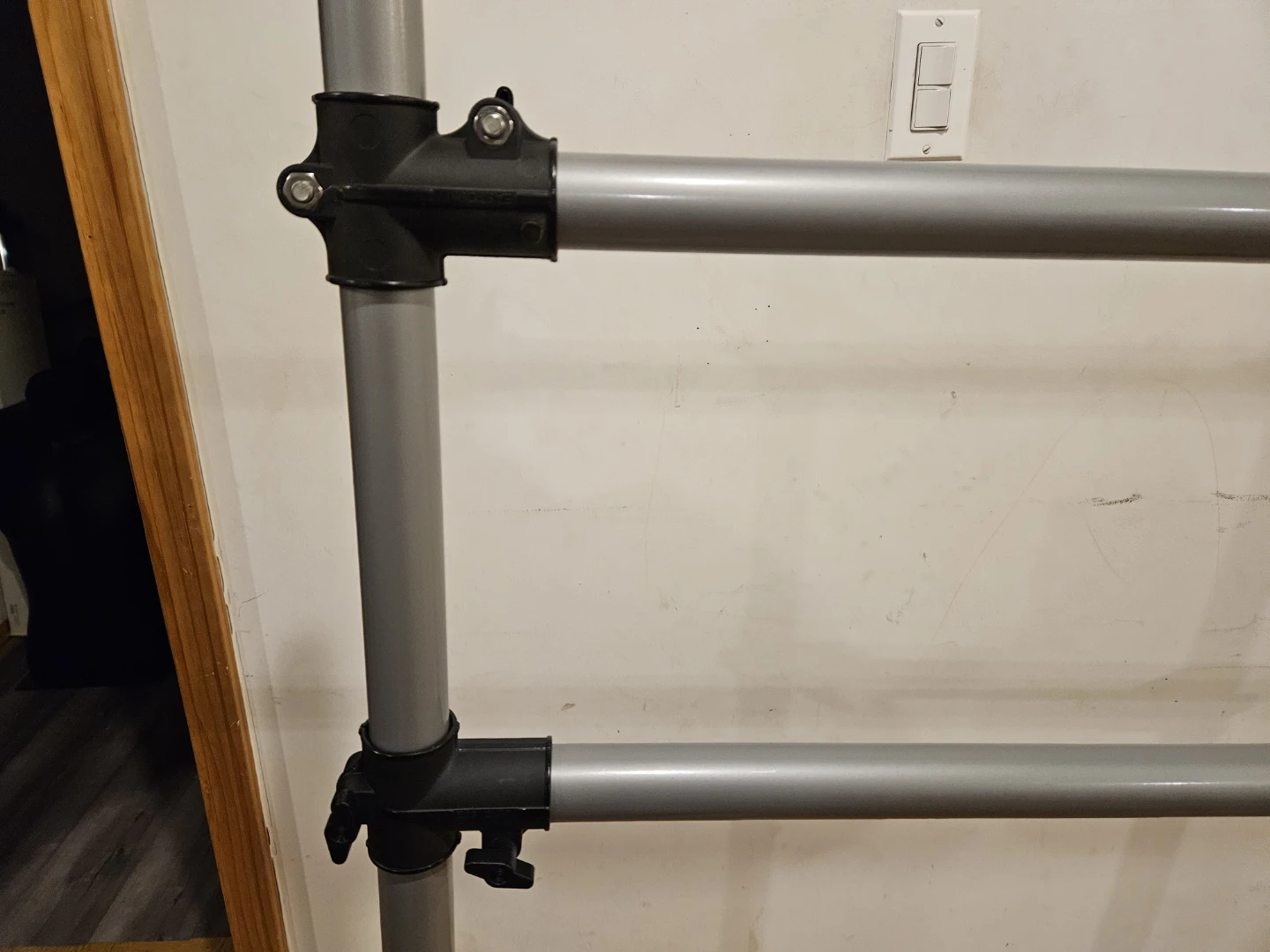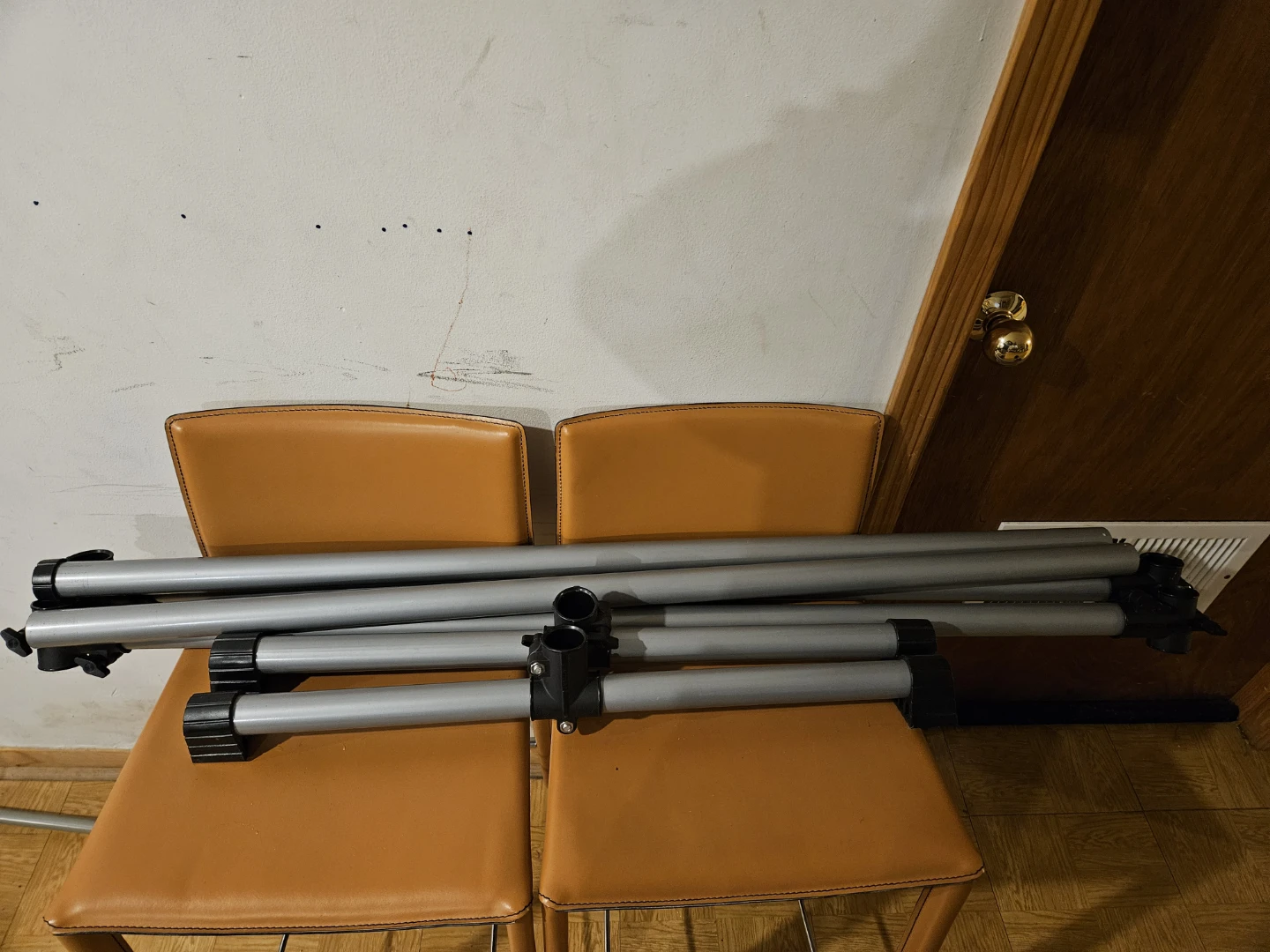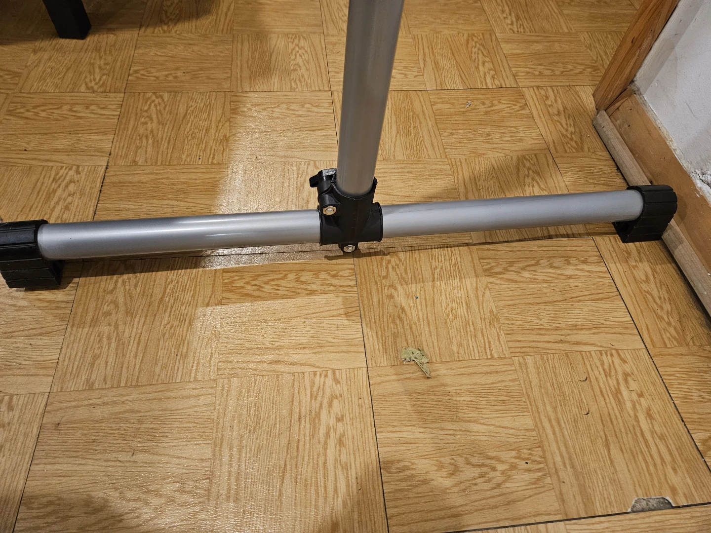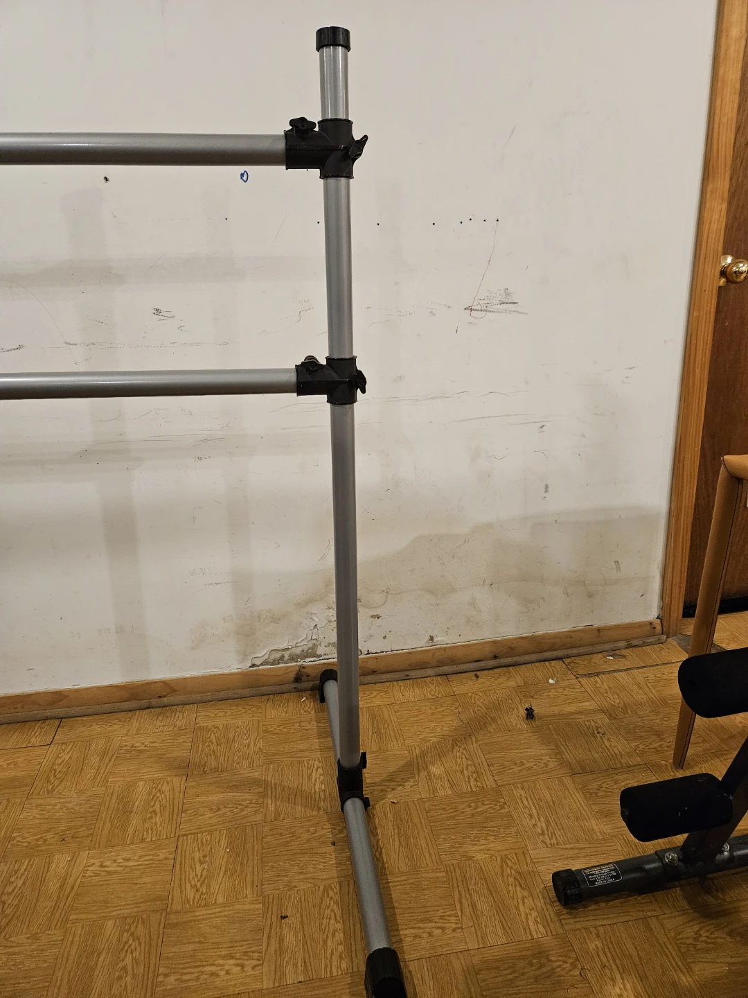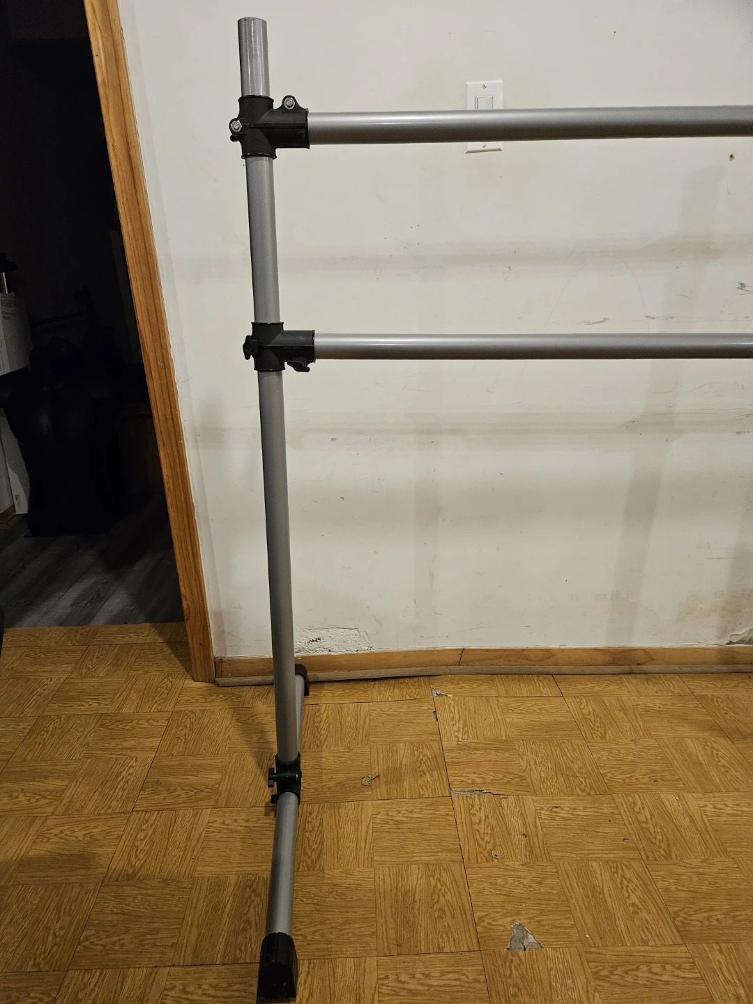 This is a portable double barre for ballet practice. It's made of sturdy metal pipes with adjustable height settings. Easy to set up and take down, it's great for home workouts or small studios!