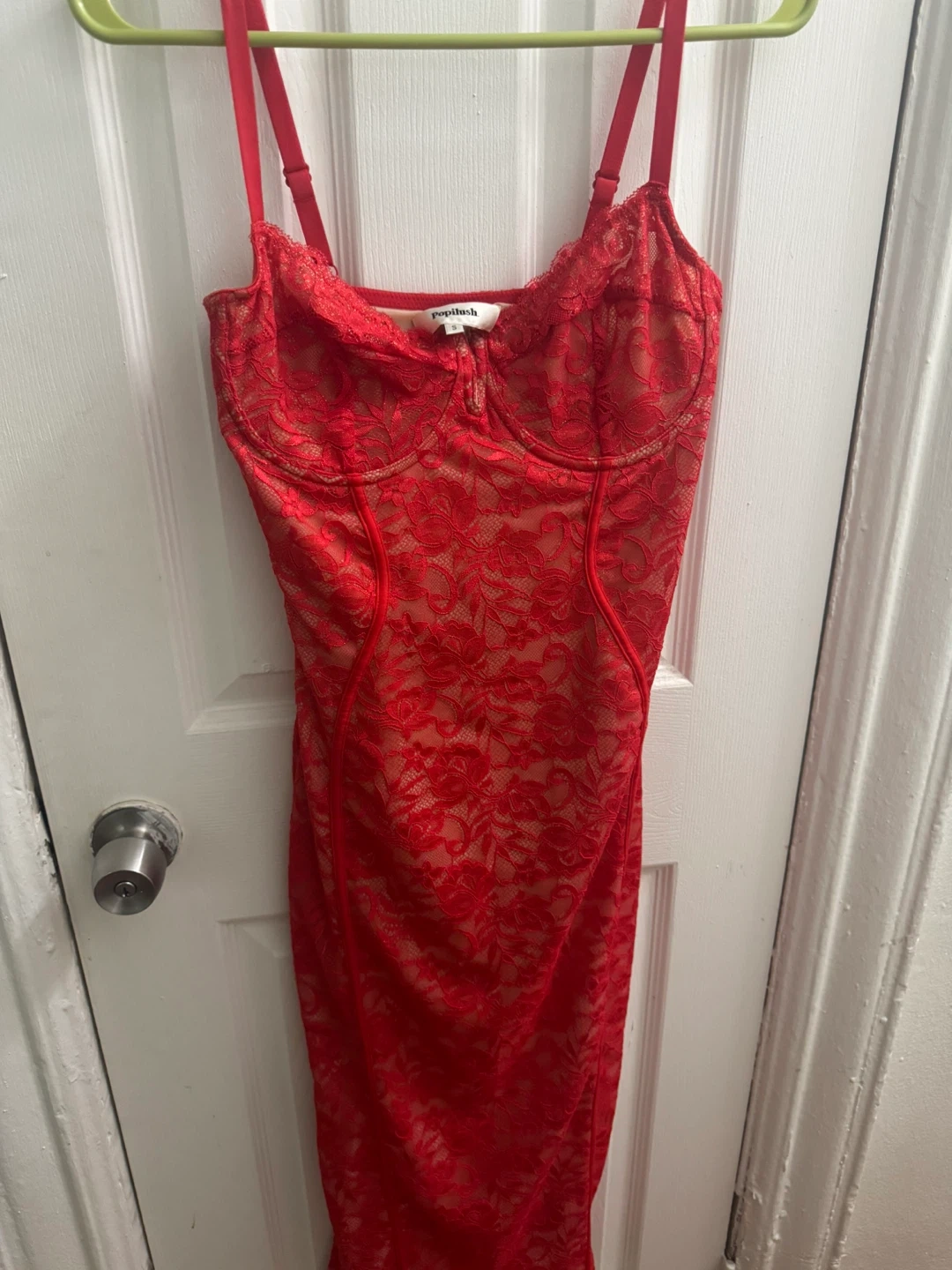 10Selling a beautiful red lace dress from Popilush in size S. It's in great condition and ready for a new home!