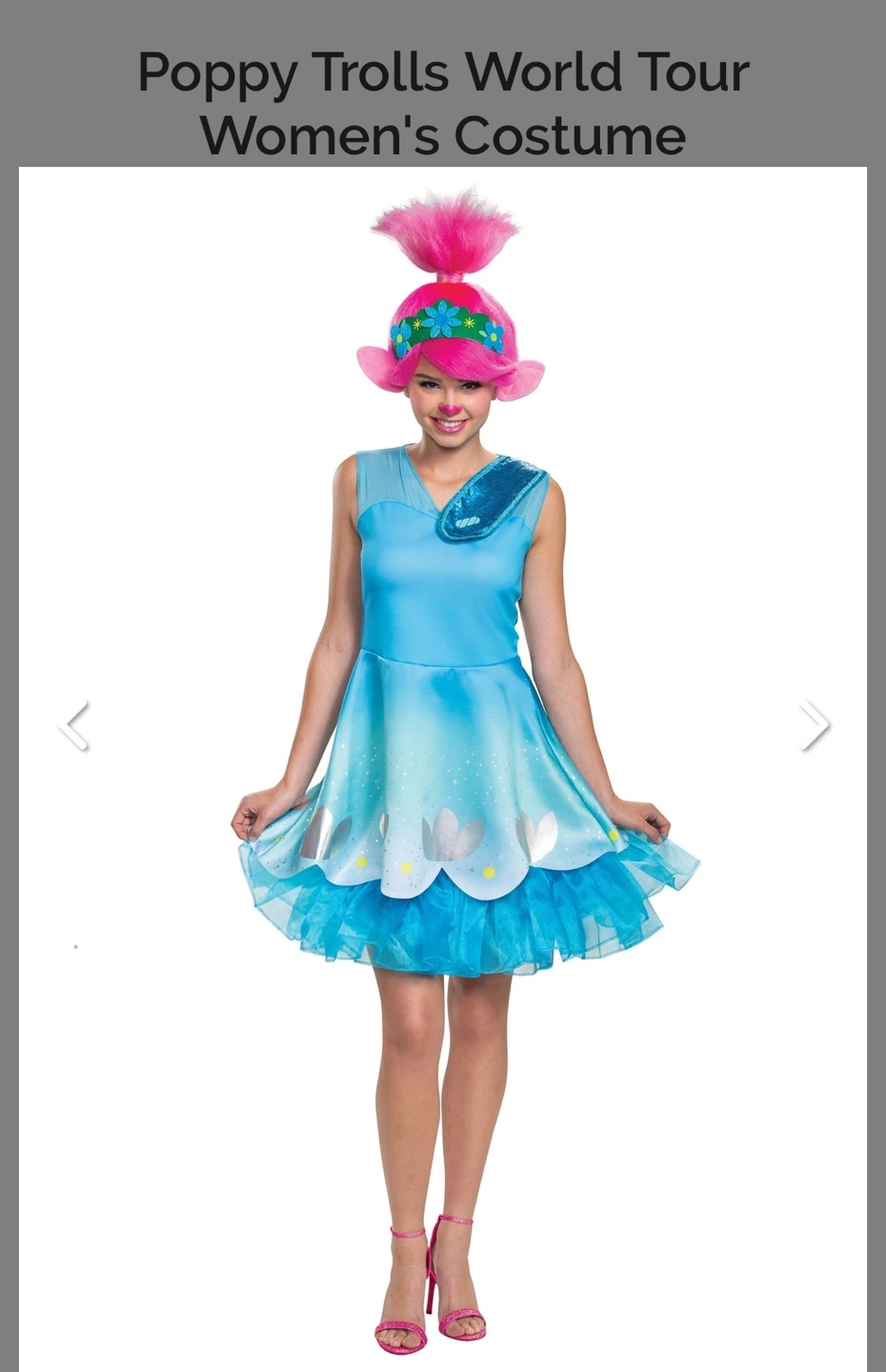 21Women's Princess Poppy Trolls World Tour costume. Blue dress with silver flowers and tulle trim. Includes headband.