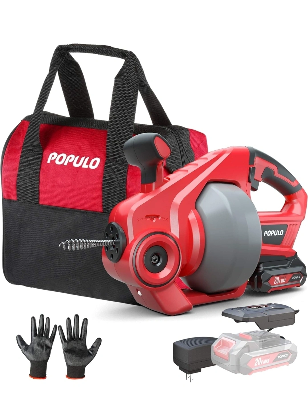 Selling a POPULO cordless drain auger in red and black. It comes with a carrying bag and gloves. The battery is a 20V MAX model. Perfect for clearing clogged drains!