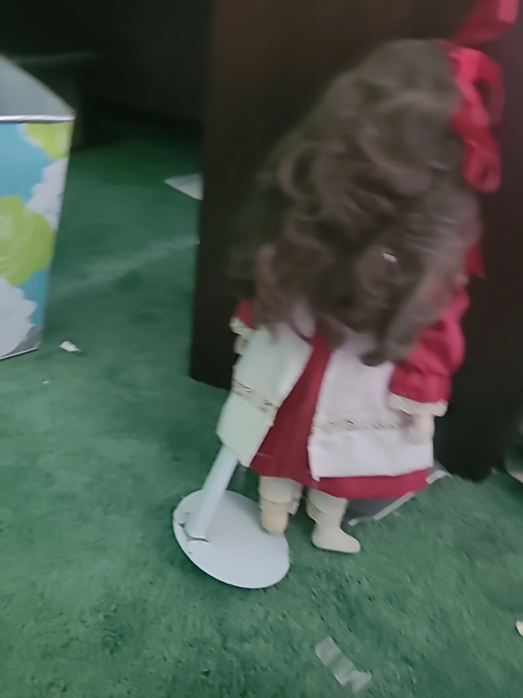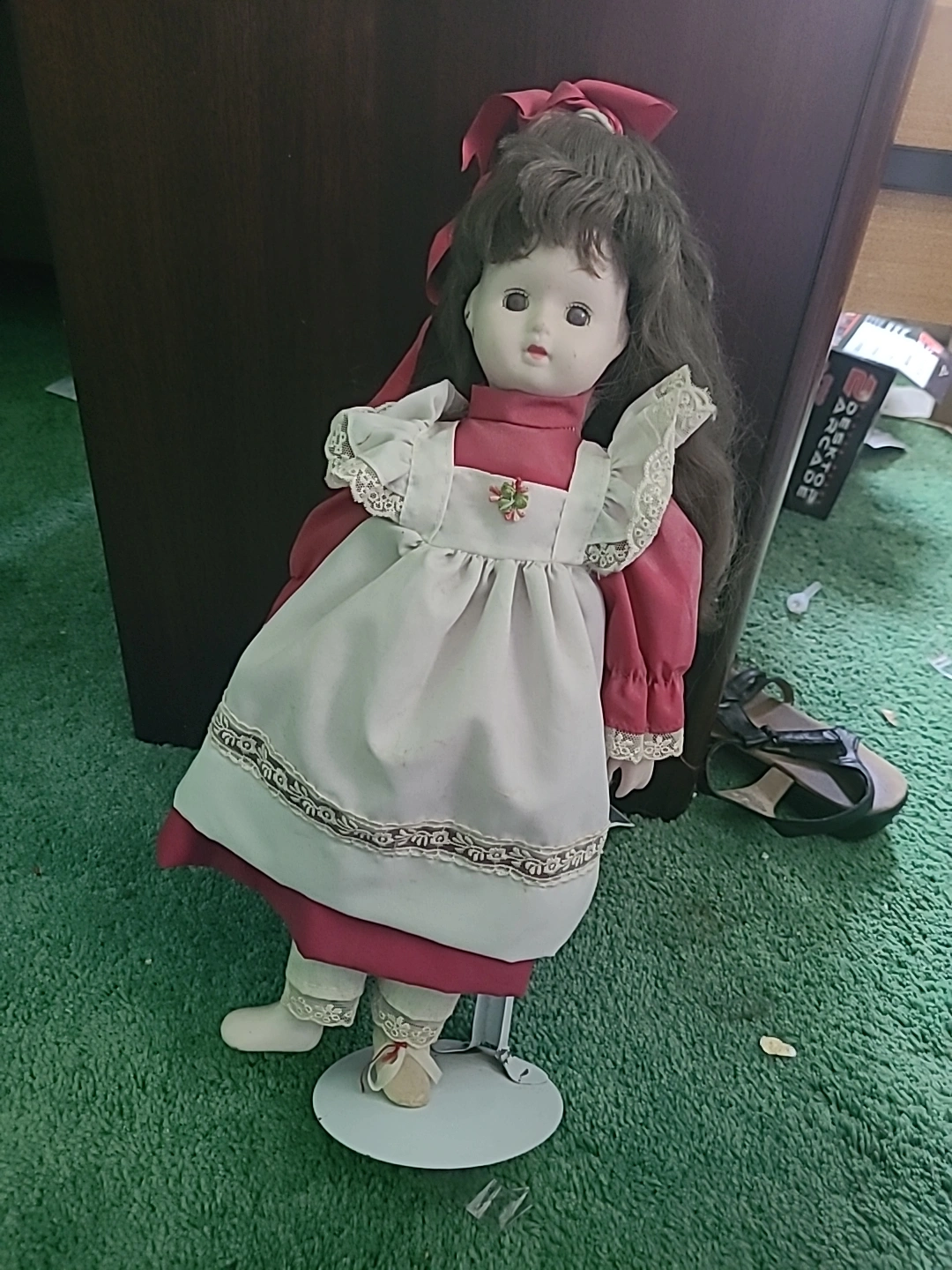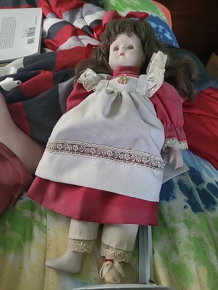 Selling a porcelain doll. She's wearing a red dress with a white apron and has brown hair with a red bow. Comes with a stand.