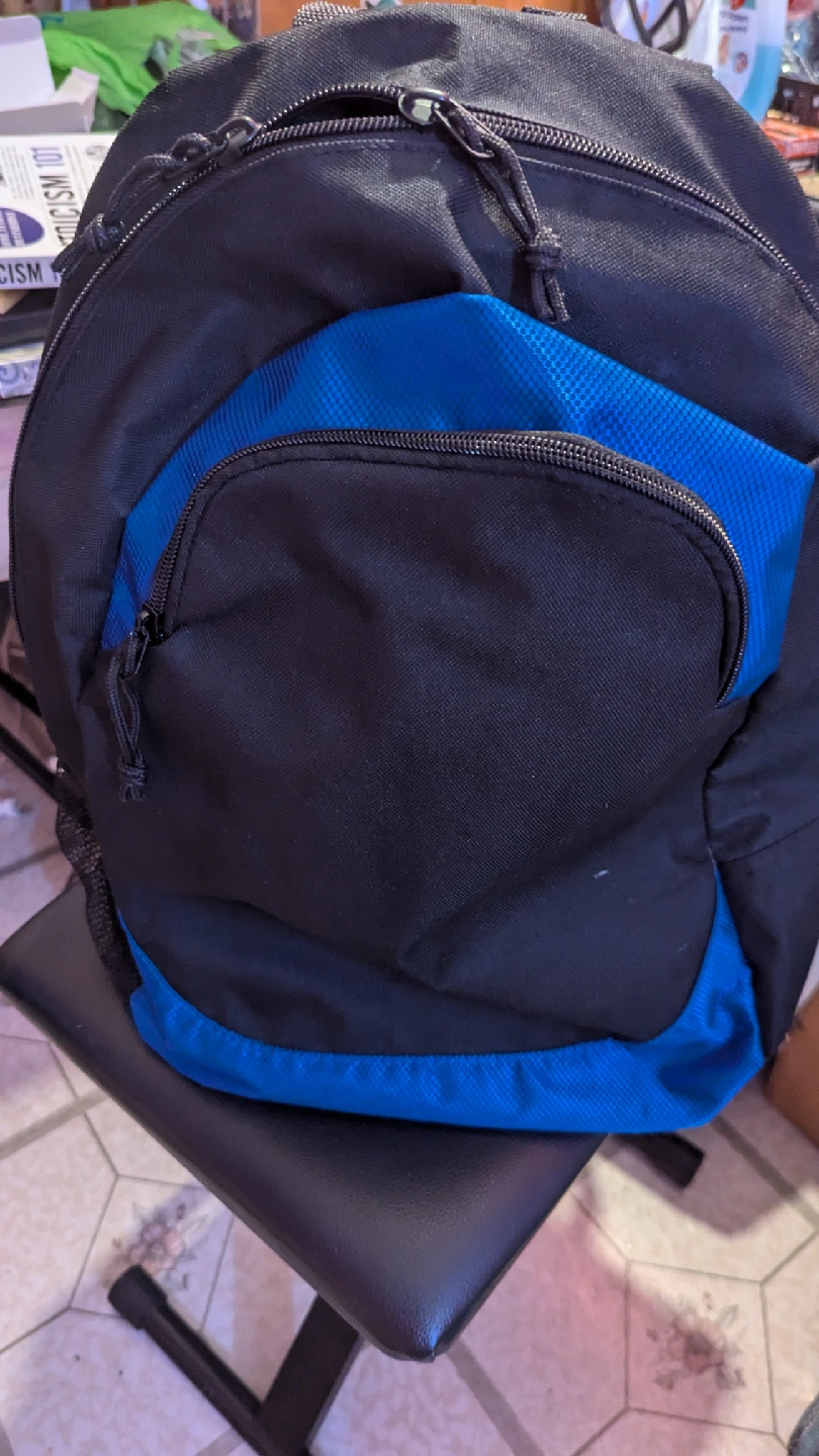 I'm selling a black and blue backpack from Port Authority. It's in great condition and ready for a new home! It features multiple zippered compartments for easy organization.🧡