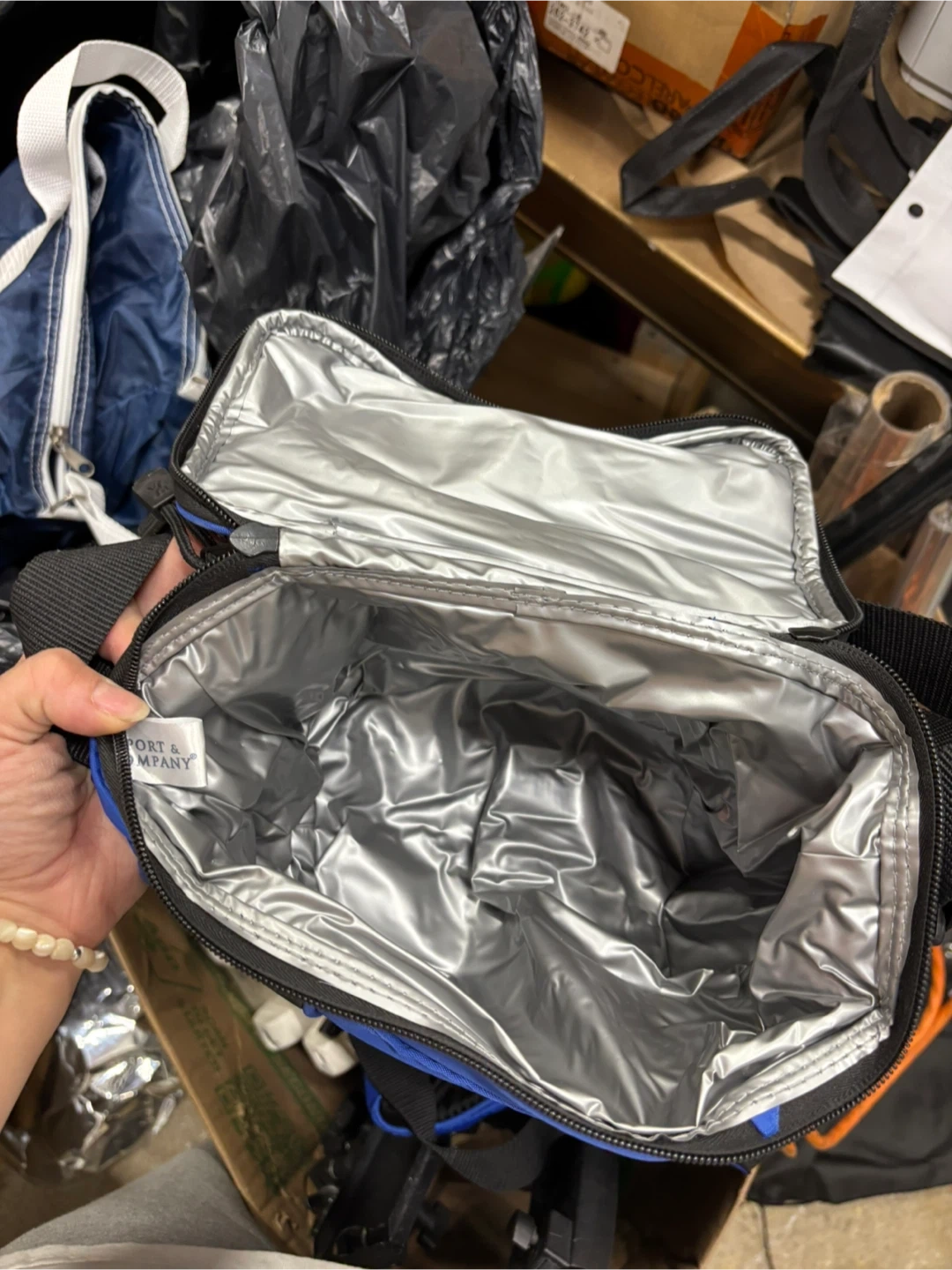 I'm selling a Port & Company lunch bag in blue and black. It's in great condition and ready to keep your lunch cool! The bag features a durable construction and a convenient size for carrying your meals. It's perfect for work, school, or picnics