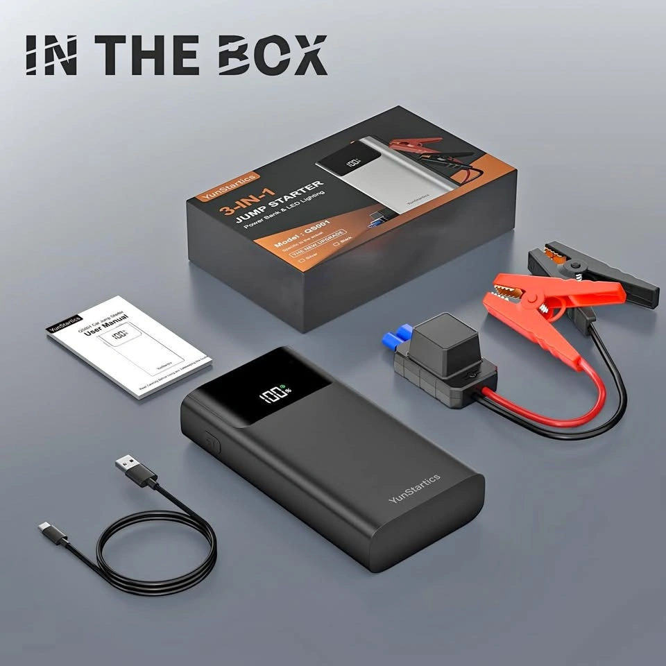 10⚡ Portable Car Jump Starter – 2000A Peak Power Bank & LED Flashlight 🚘 More Than a Jump Starter: This versatile device works as a jump starter, power bank, and LED flashlight (3 modes: Flashlight / Strobe / SOS). A reliable all-in-one companion for travel, emergencies, or outdoor adventures. 🔋 High-Capacity Performance: Delivers up to 2000A peak current to safely start all gas and diesel engines, even with dead batteries. Ideal for cars, motorcycles, SUVs, trucks, and lawnmowers. One full charge can jump-start most vehicles over 60 times. 🛡️ Smart Multi-Layer Protection: Built-in 8 advanced safety protections — including overcharge, over-discharge, overpower, overvoltage, short-circuit, magnetic field, high-temperature, and restore protection — for spark-free, worry-free operation every time. 🔌 Power Bank + 3-Mode LED Light: Features a Type-C input port and 5V/2A USB output to charge phones, tablets, or other devices on the go. Includes a bright LED flashlight with 3 modes (Lighting / Flash / SOS) — perfect for emergencies or nighttime use.