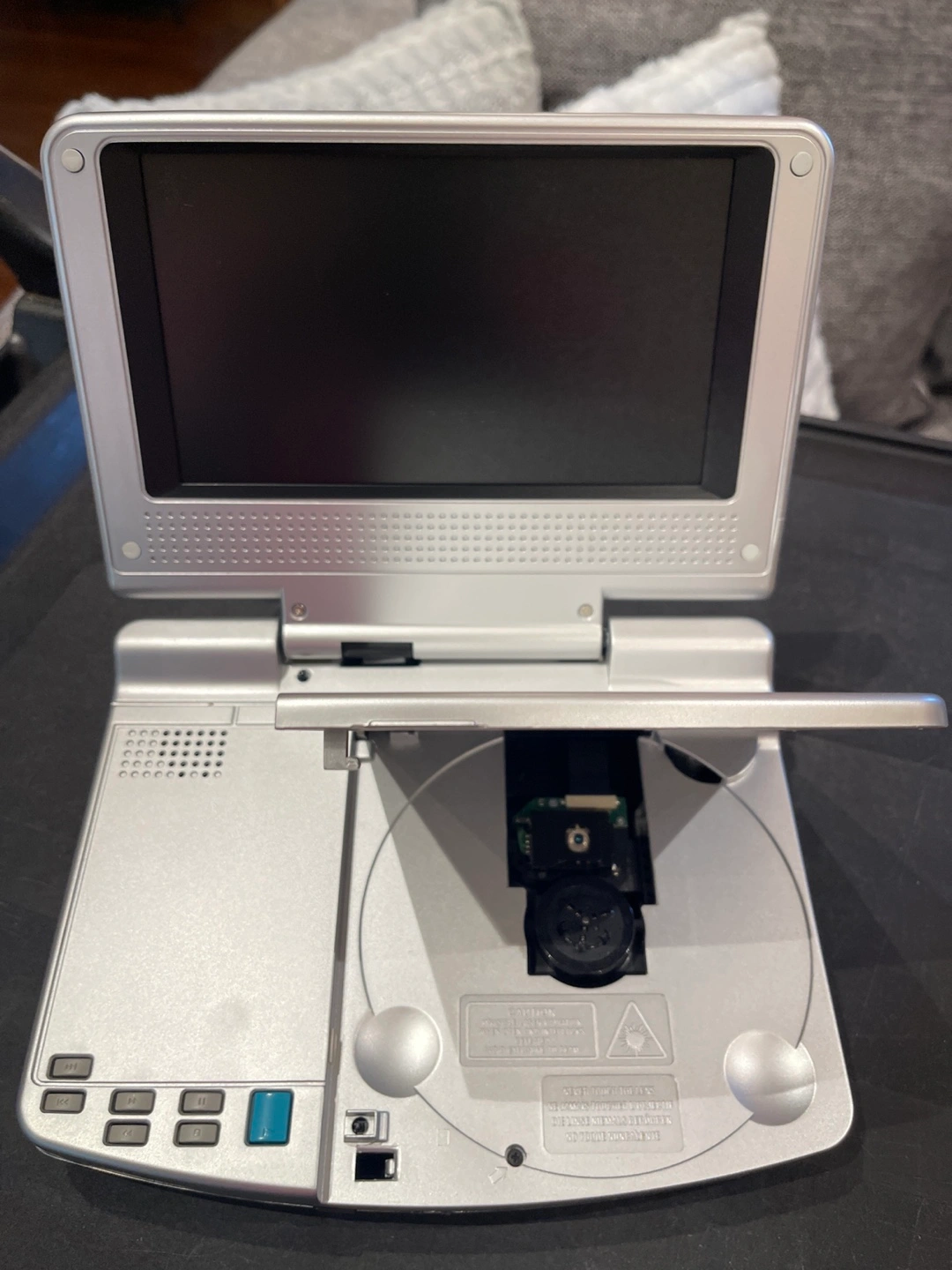 Selling a portable DVD player in silver. This would be great for road trips or just watching movies on the go. Perfect for kids!
