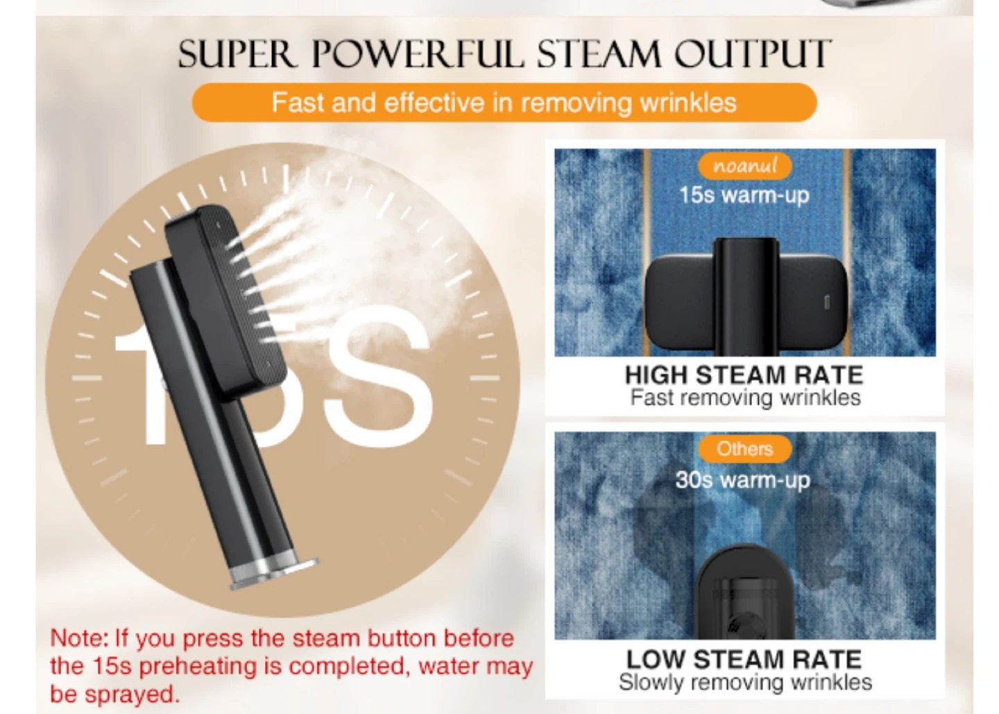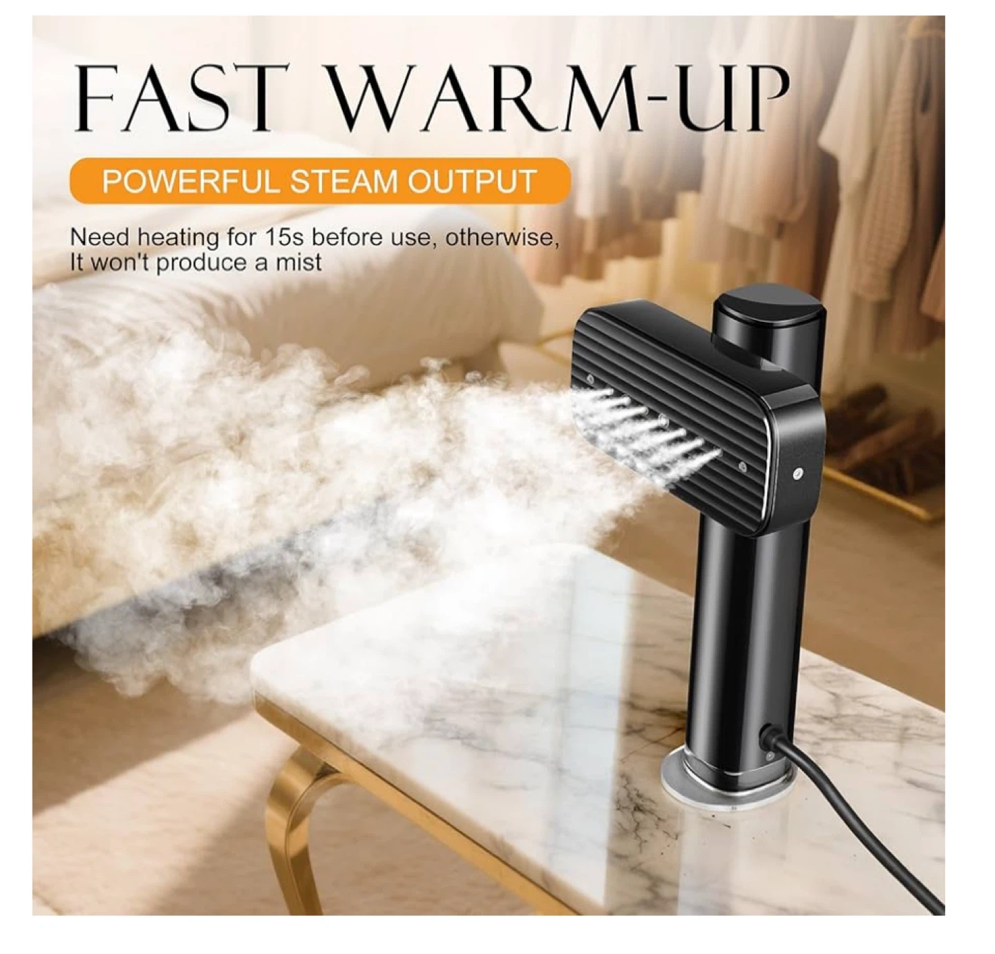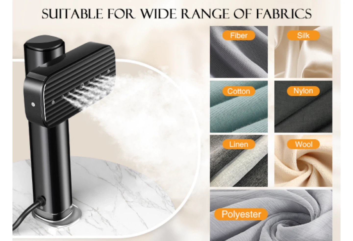 111This is a portable handheld clothes steamer that is fast and effective in removing wrinkles. It has a super powerful steam output and is suitable for a wide range of fabrics like fiber, silk, cotton, nylon, linen, wool, and polyester. It heats up in just 15 seconds!