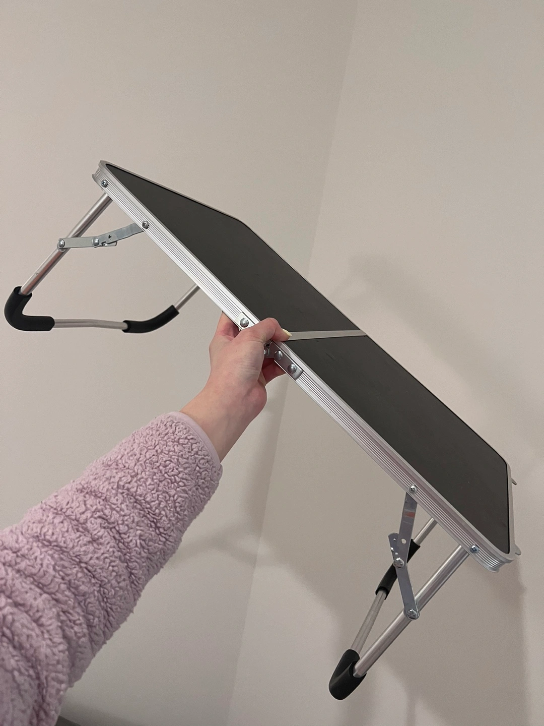 Foldable laptop desk. Aluminum frame. Black surface. Great for travel or home use.