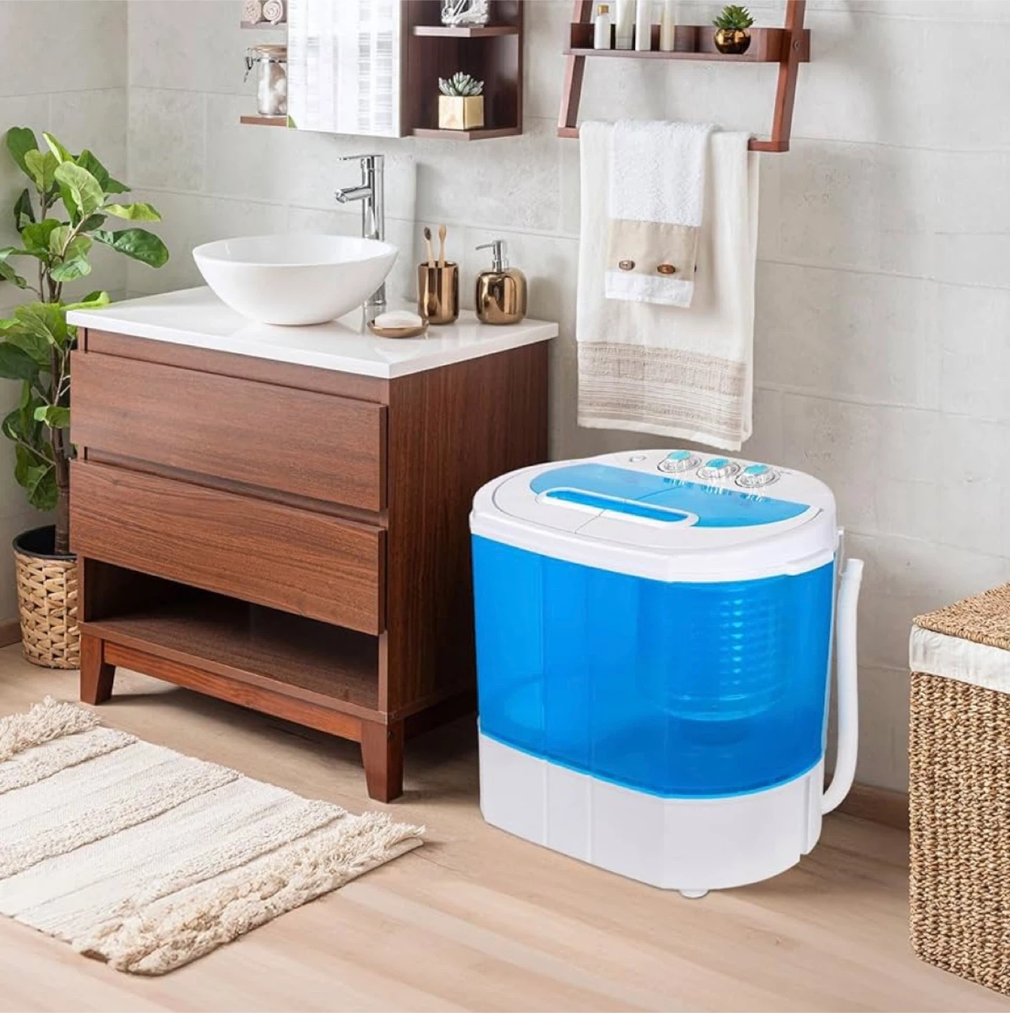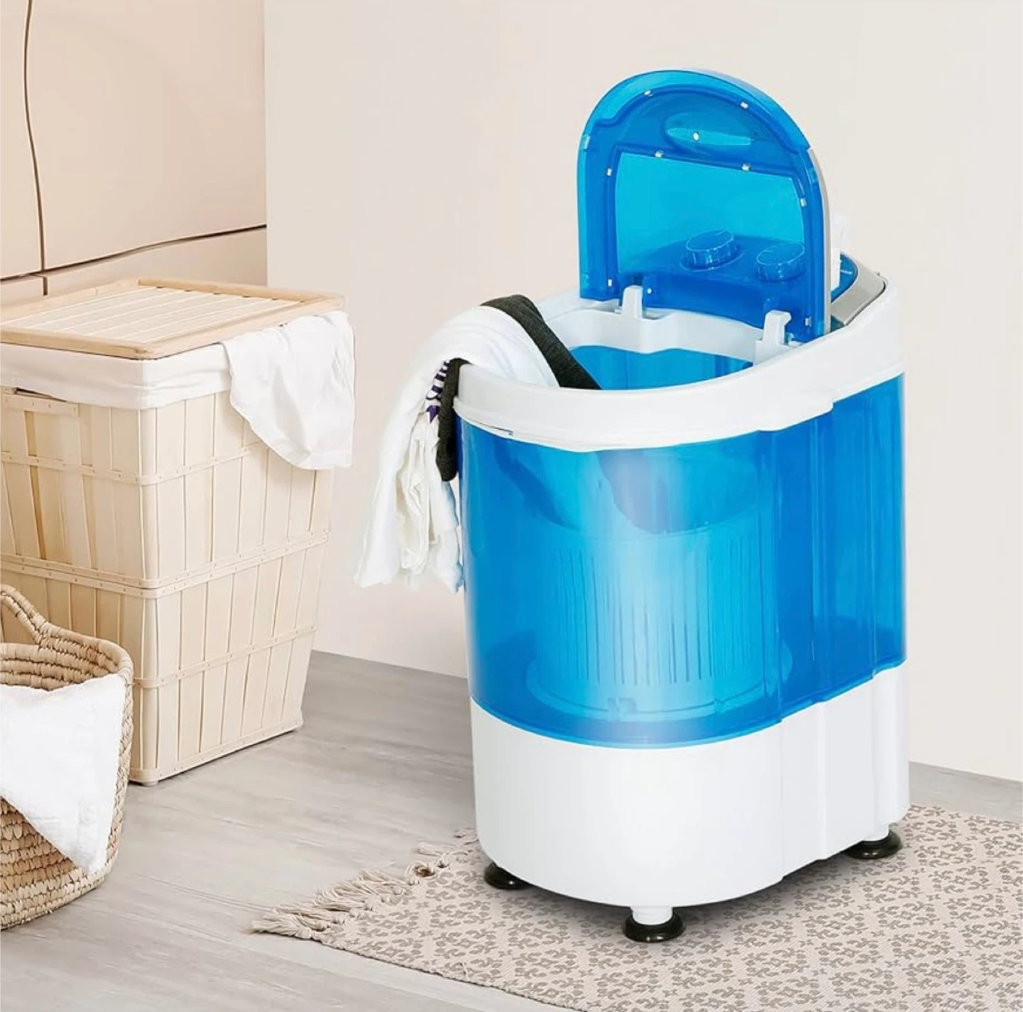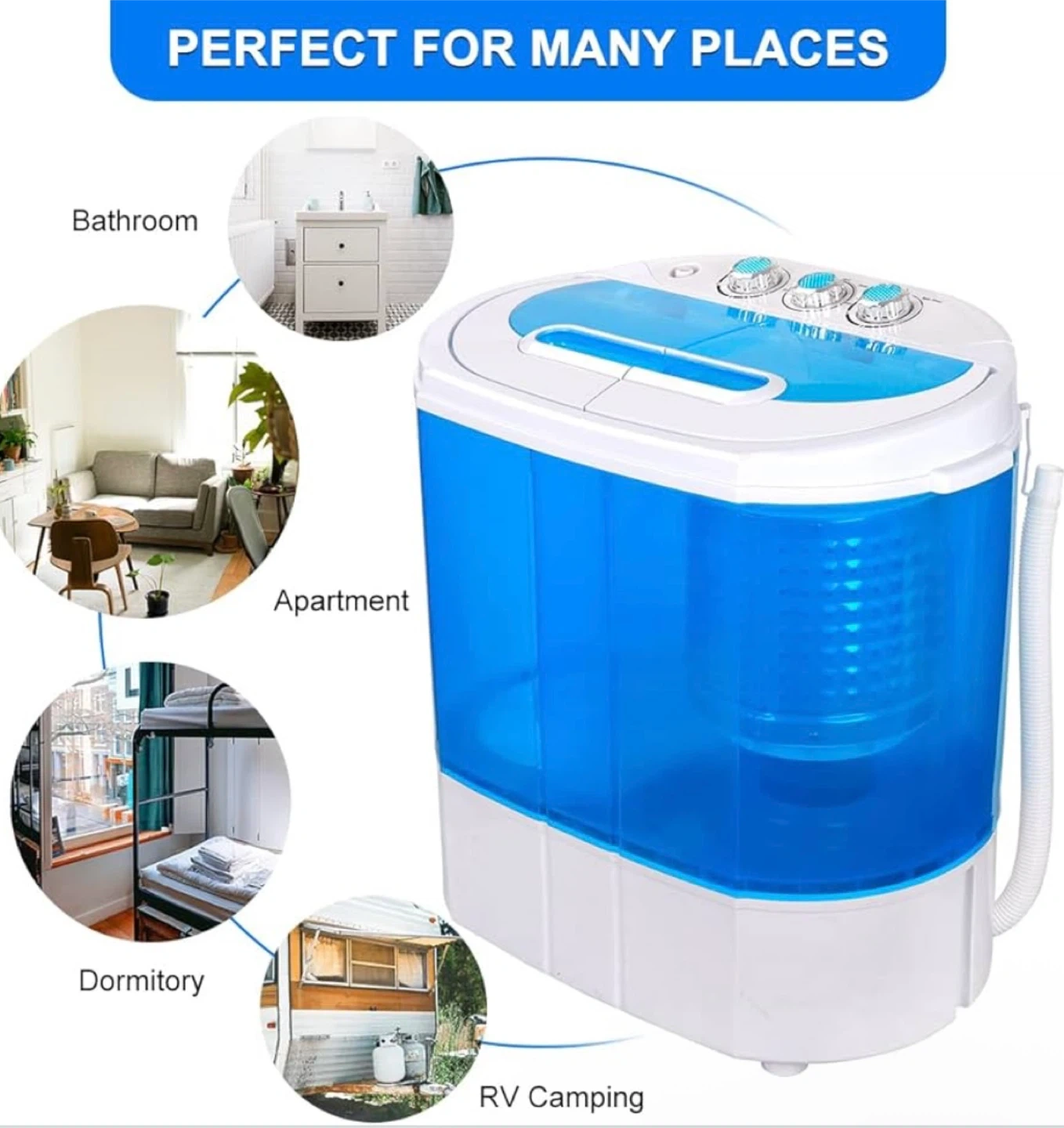 Looking to sell this portable mini washing machine! It's in great condition and perfect for apartments, dorms, or even RV camping. The blue and white design is sleek and modern. It's compact and easy to use, making laundry a breeze wherever you are