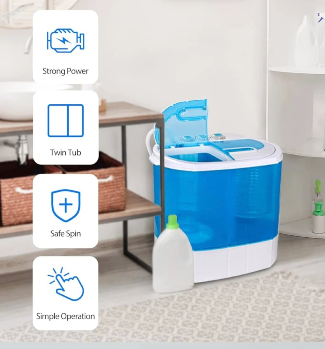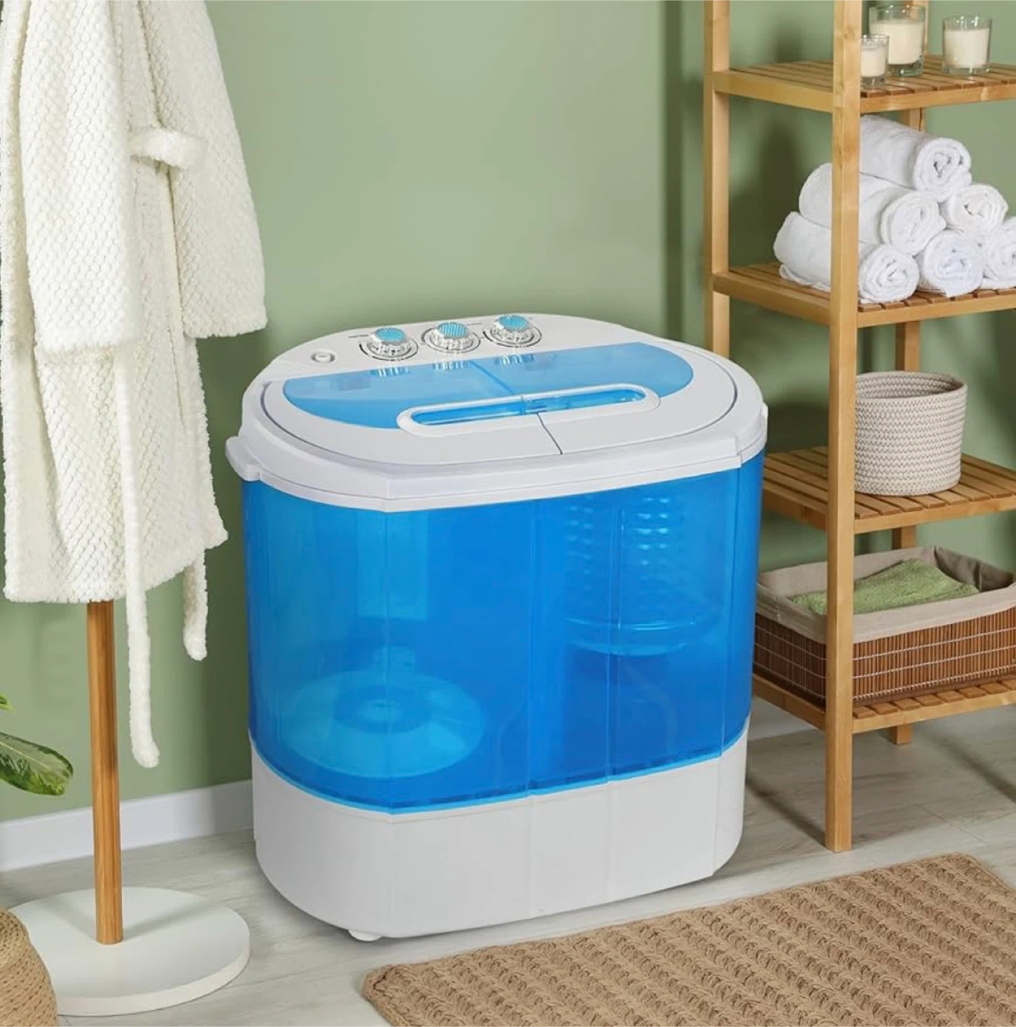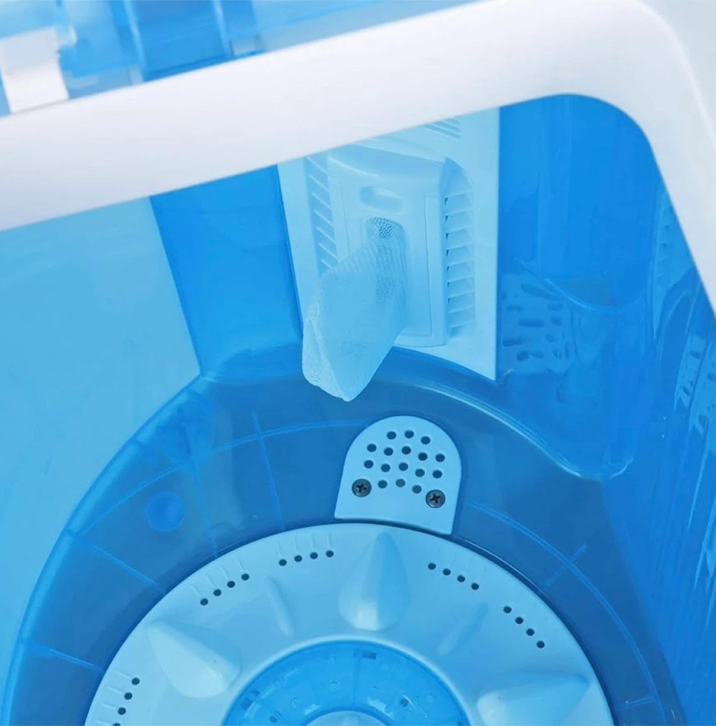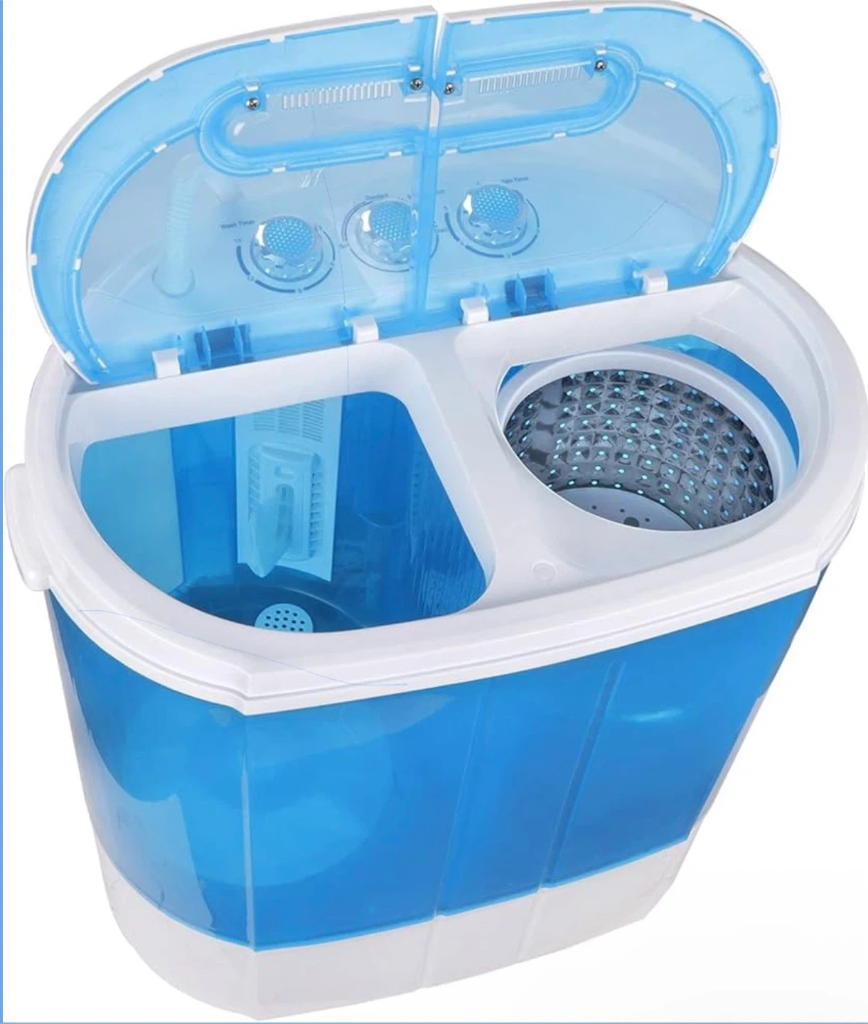 Looking to sell this portable mini washing machine! It's in great condition and perfect for apartments, dorms, or even RV camping. The blue and white design is sleek and modern. It's compact and easy to use, making laundry a breeze wherever you are