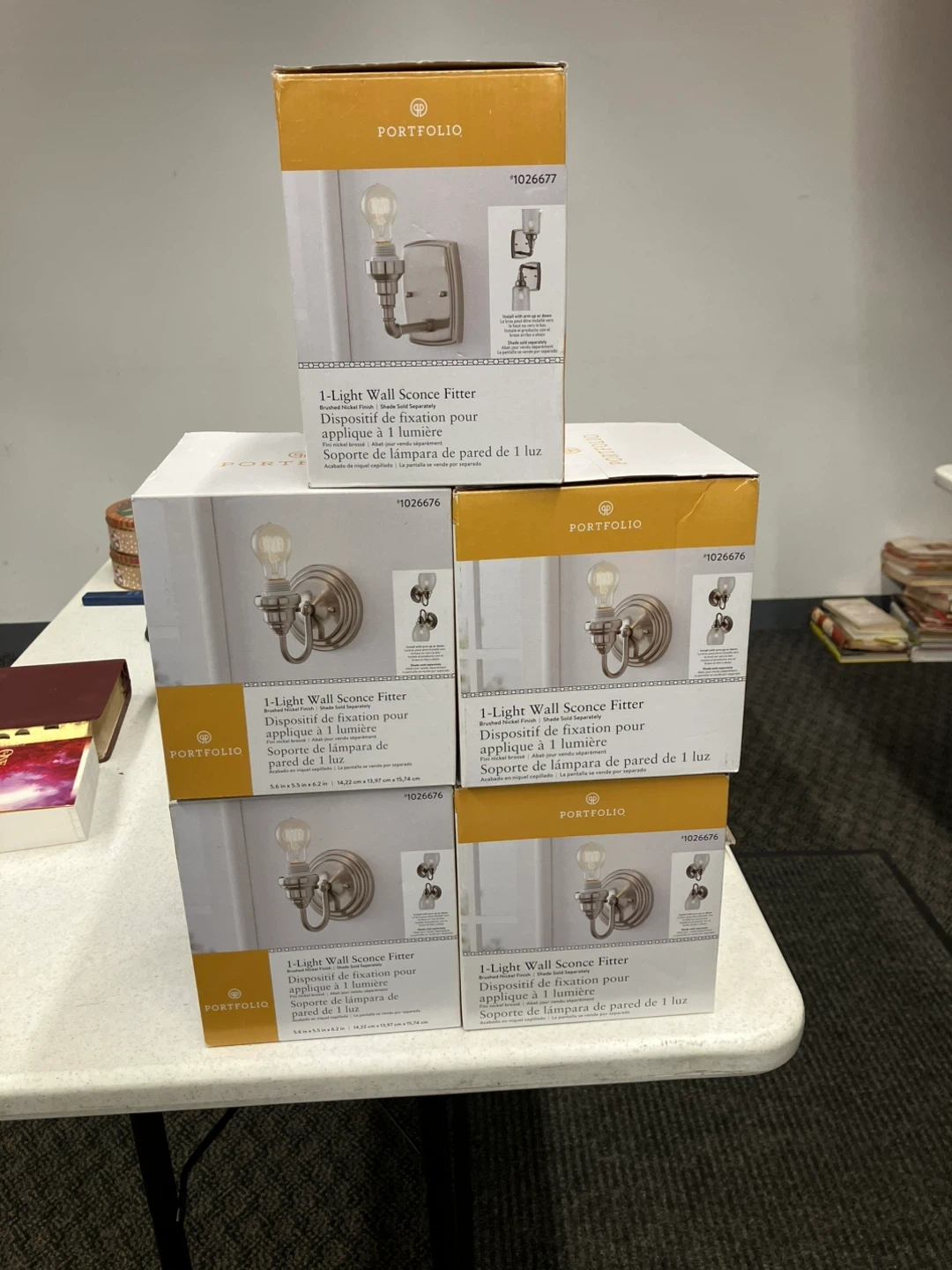 $10 For all 5! Selling a Portfolio 1-Light Wall Sconce Fitters with a brushed nickel finish! Shade is sold separately. It measures 5.6 x 5.5 inches (14.22 cm x 13.97 cm). Great for adding a touch of elegance to any room