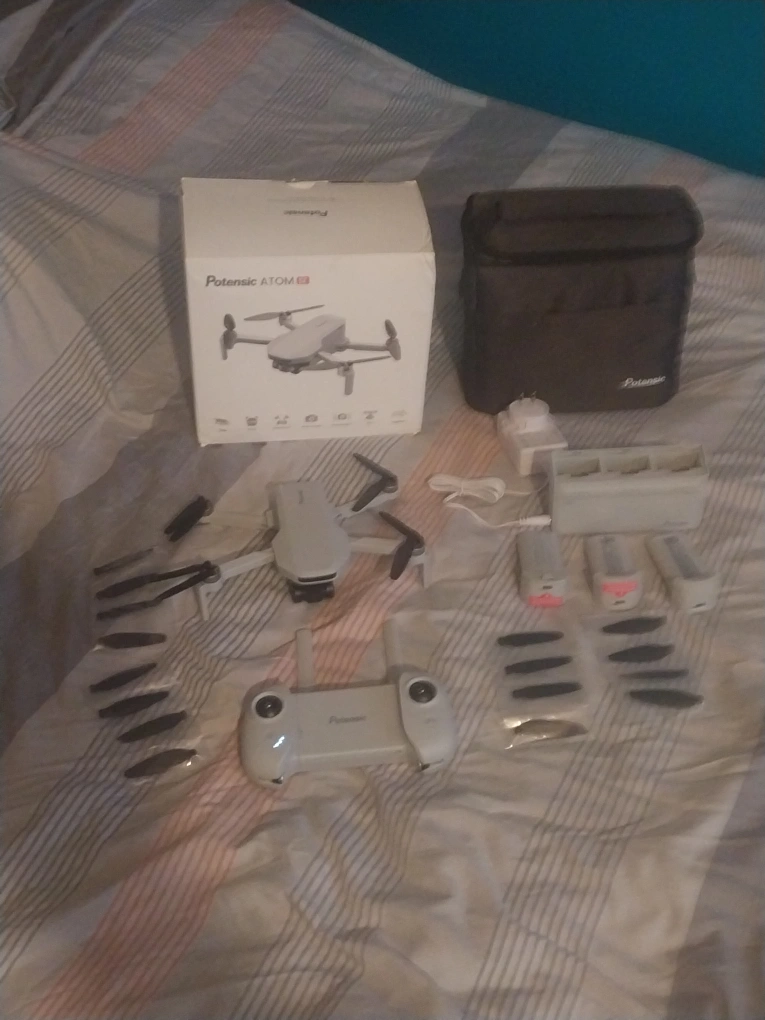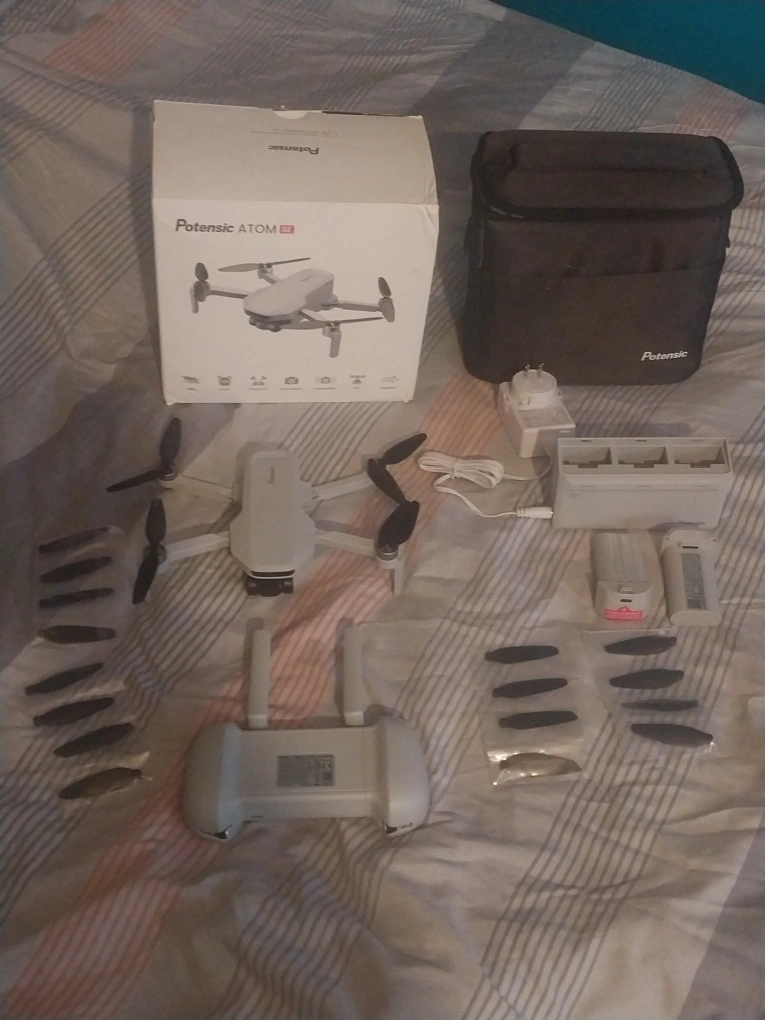 Selling a Potensic ATOM SE drone. It comes with the original box and all included components such as the controller, batteries, charger, extra propellers, and a carrying case. Ready for some high-flying fun!.