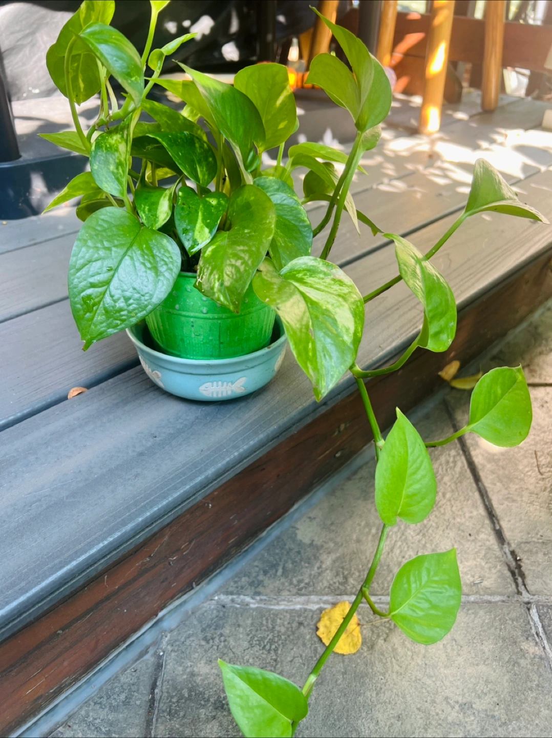 I'm selling a beautiful pothos plant in a black pot. It has vibrant green and yellow leaves. It's a great addition to any home!
