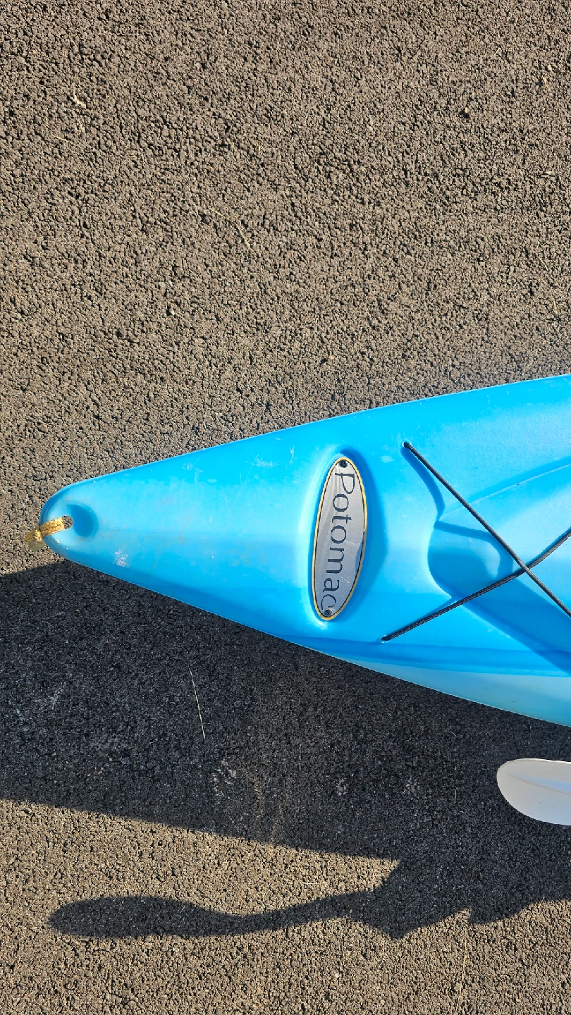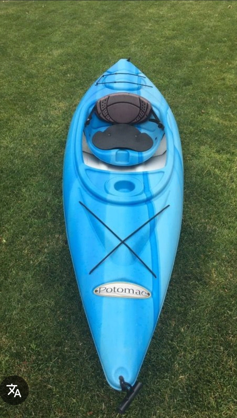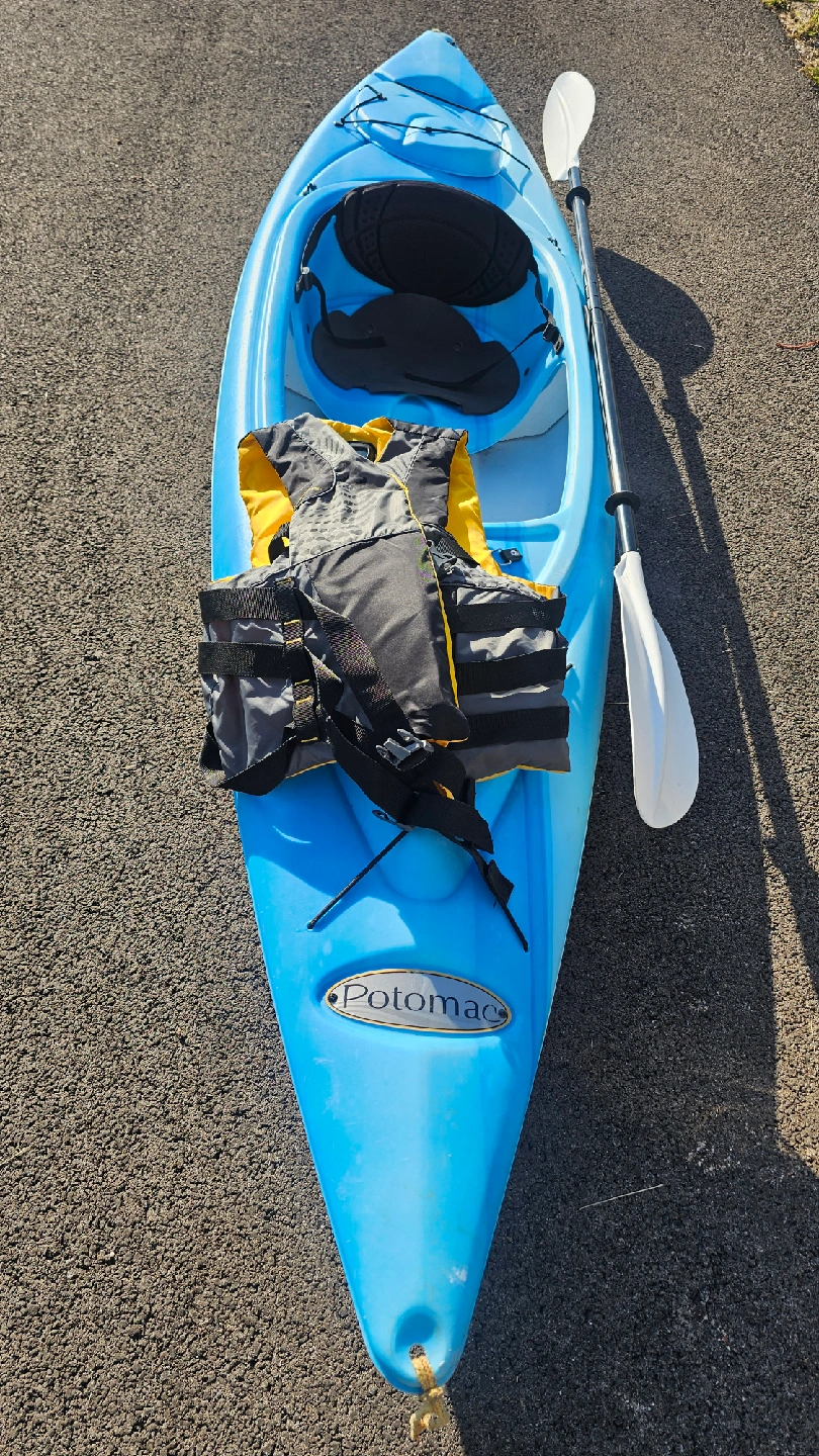 Selling a blue Potomac Pathfinder 100 kayak, great for beginners and novice paddlers! It features a shallow v-chine hull for stability, and is made of polyethylene. It has an adjustable padded backrest with a seat pad, adjustable foot pegs, carrying handles, and a cockpit table with a bottle holder. There are also elastic bungee cords in the bow and a stem storage hatch with bungees. Dimensions are 28 x 14 x 100, and it has a capacity of 275 lb