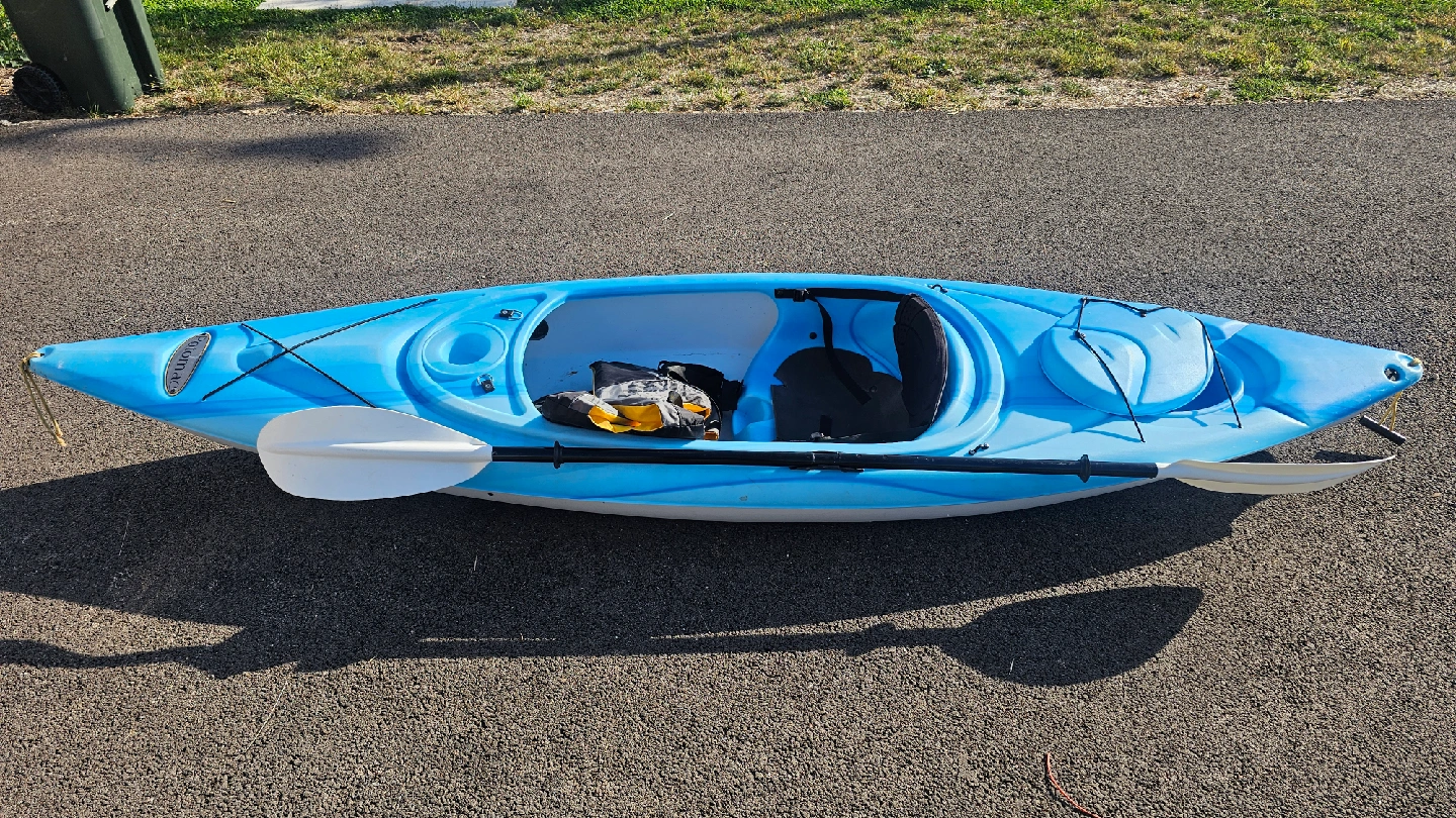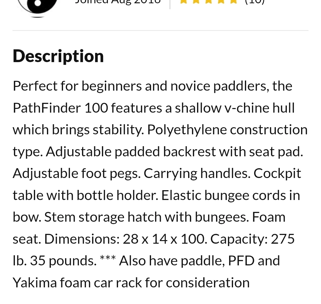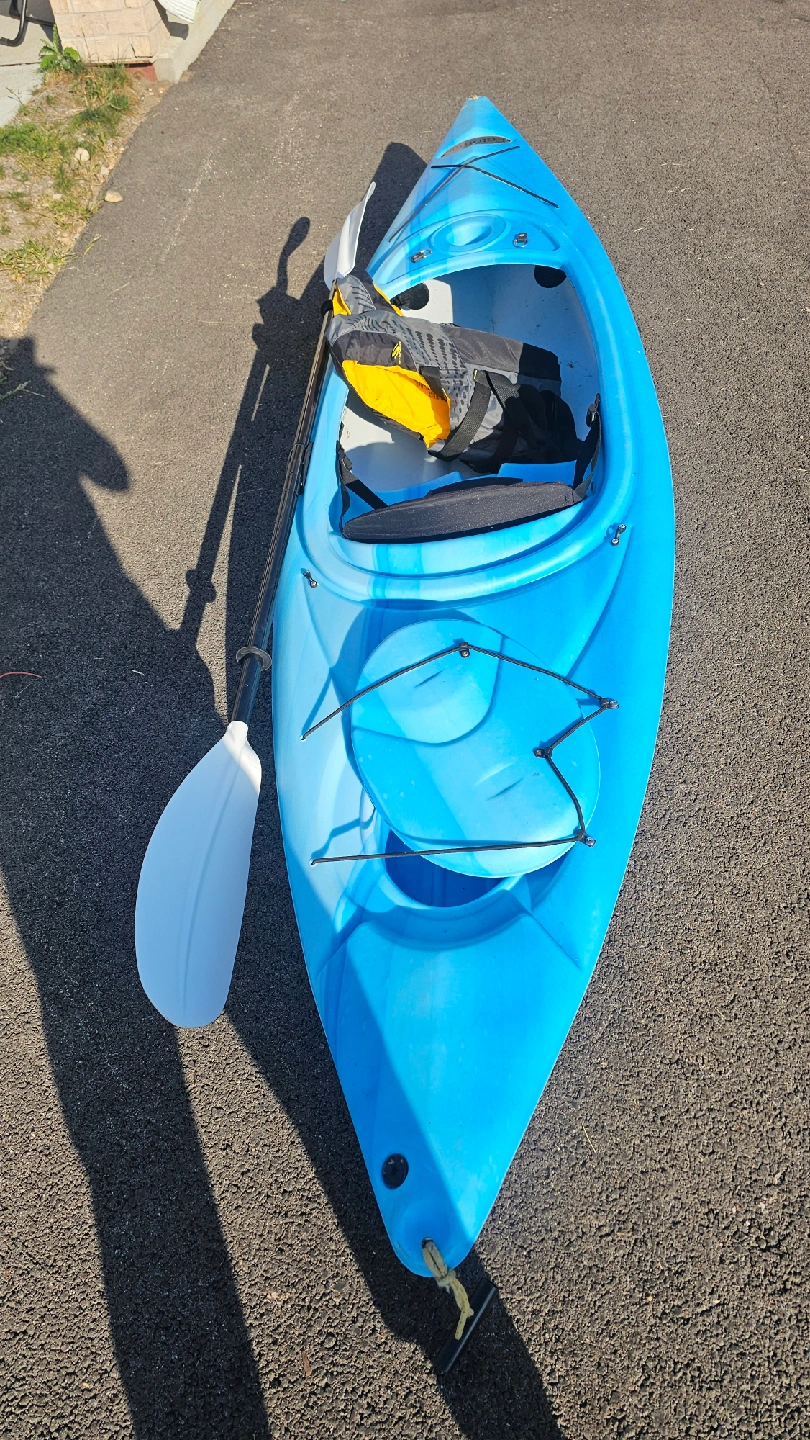 Selling a blue Potomac Pathfinder 100 kayak, great for beginners and novice paddlers! It features a shallow v-chine hull for stability, and is made of polyethylene. It has an adjustable padded backrest with a seat pad, adjustable foot pegs, carrying handles, and a cockpit table with a bottle holder. There are also elastic bungee cords in the bow and a stem storage hatch with bungees. Dimensions are 28 x 14 x 100, and it has a capacity of 275 lb