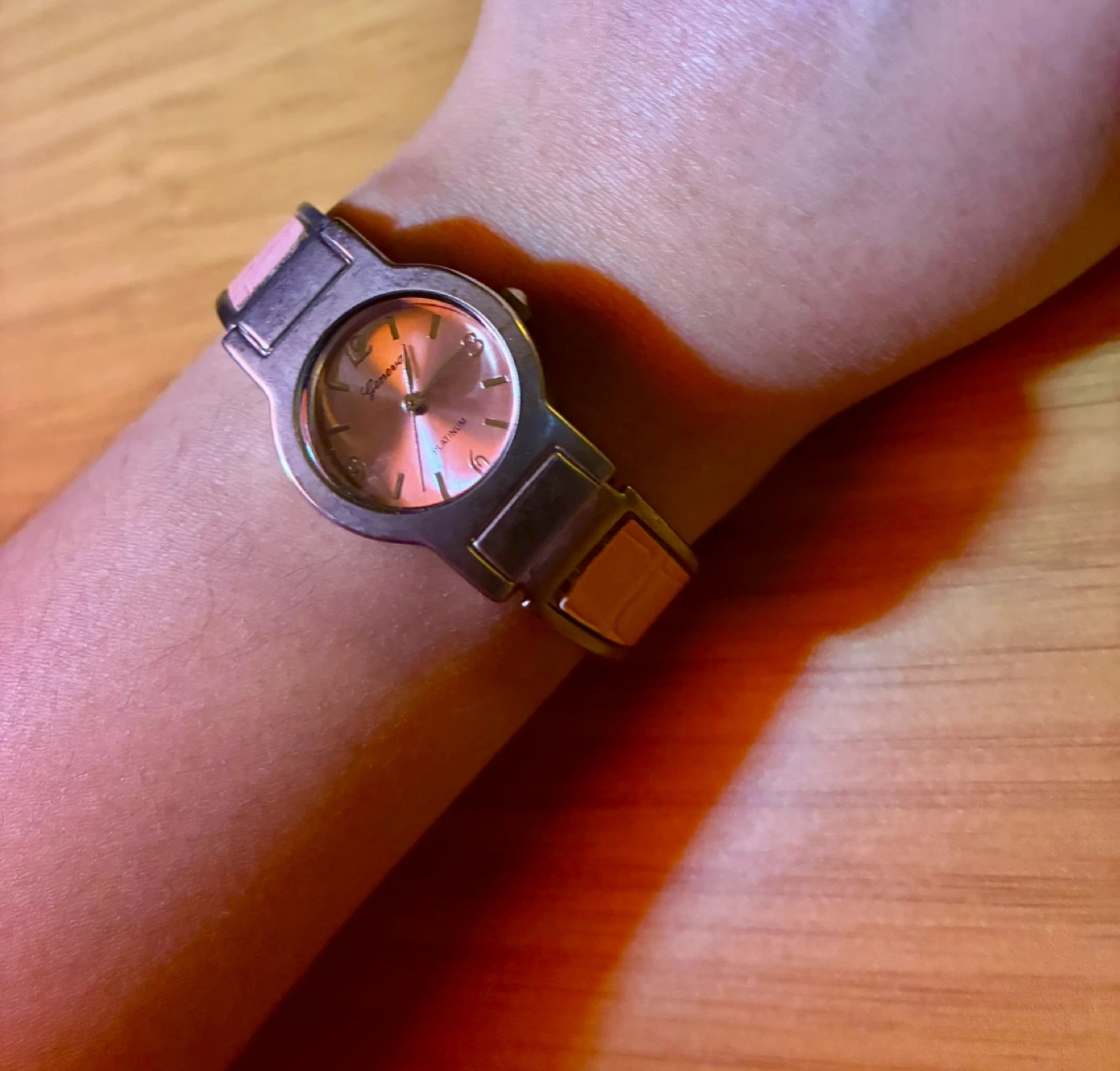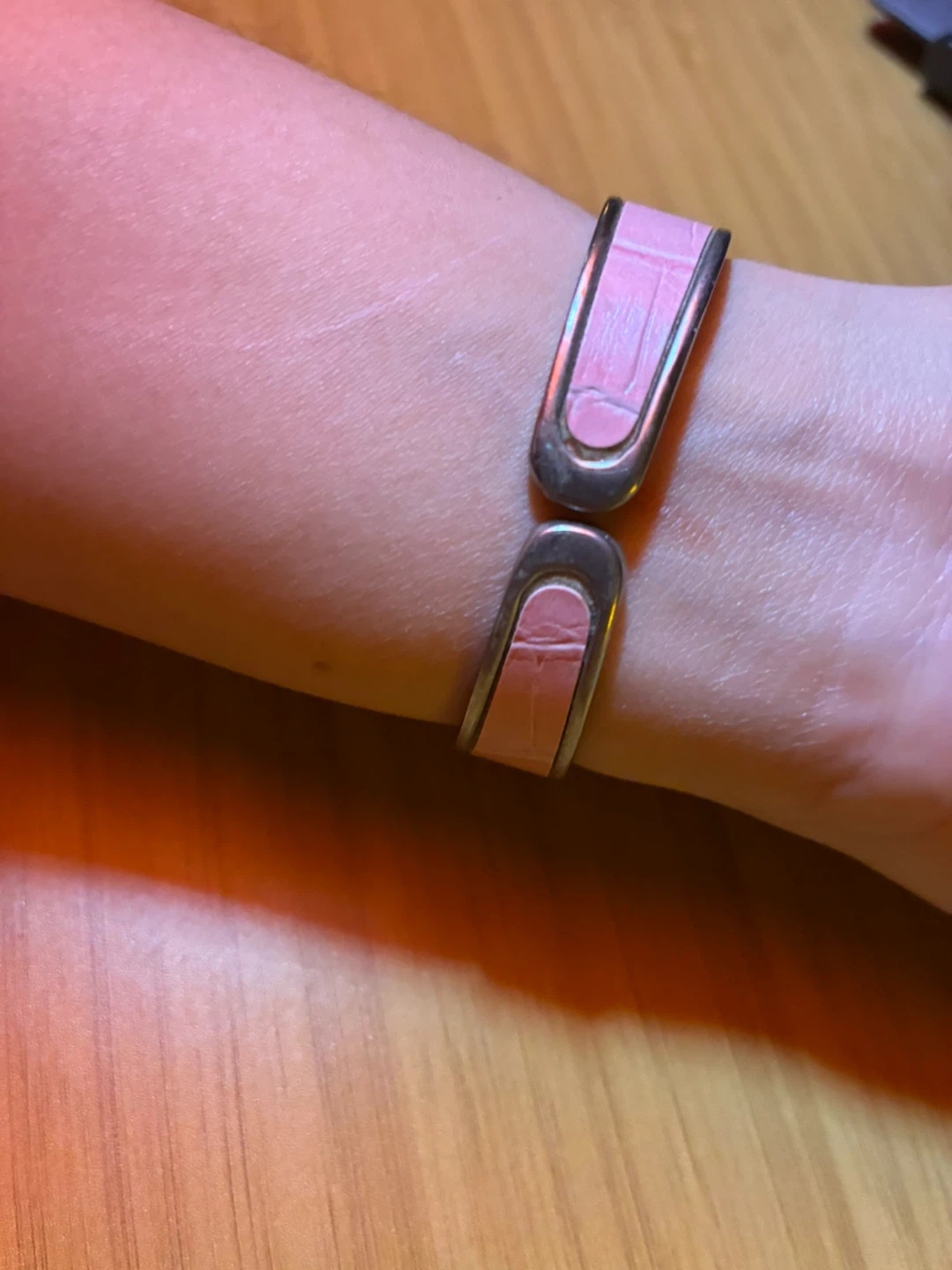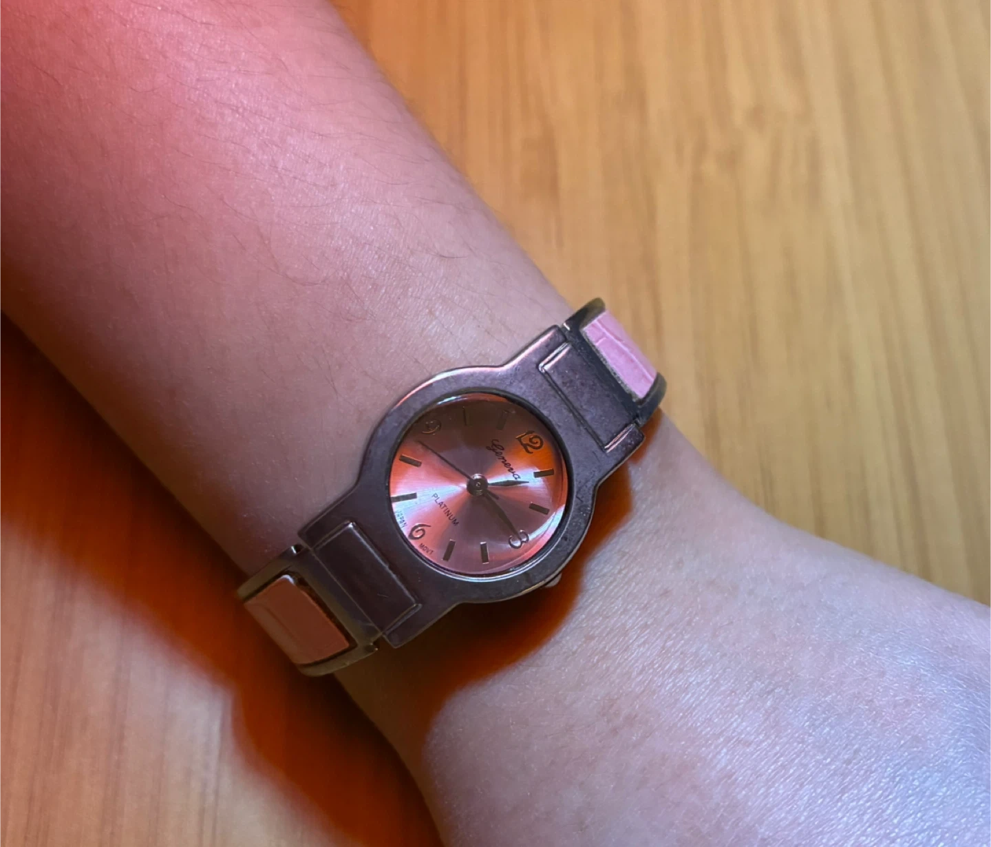 This Geneva Platinum watch has a beautiful rose-gold colored face and a pink band. It's a stylish accessory for everyday wear. The watch features a unique cuff-style closure.