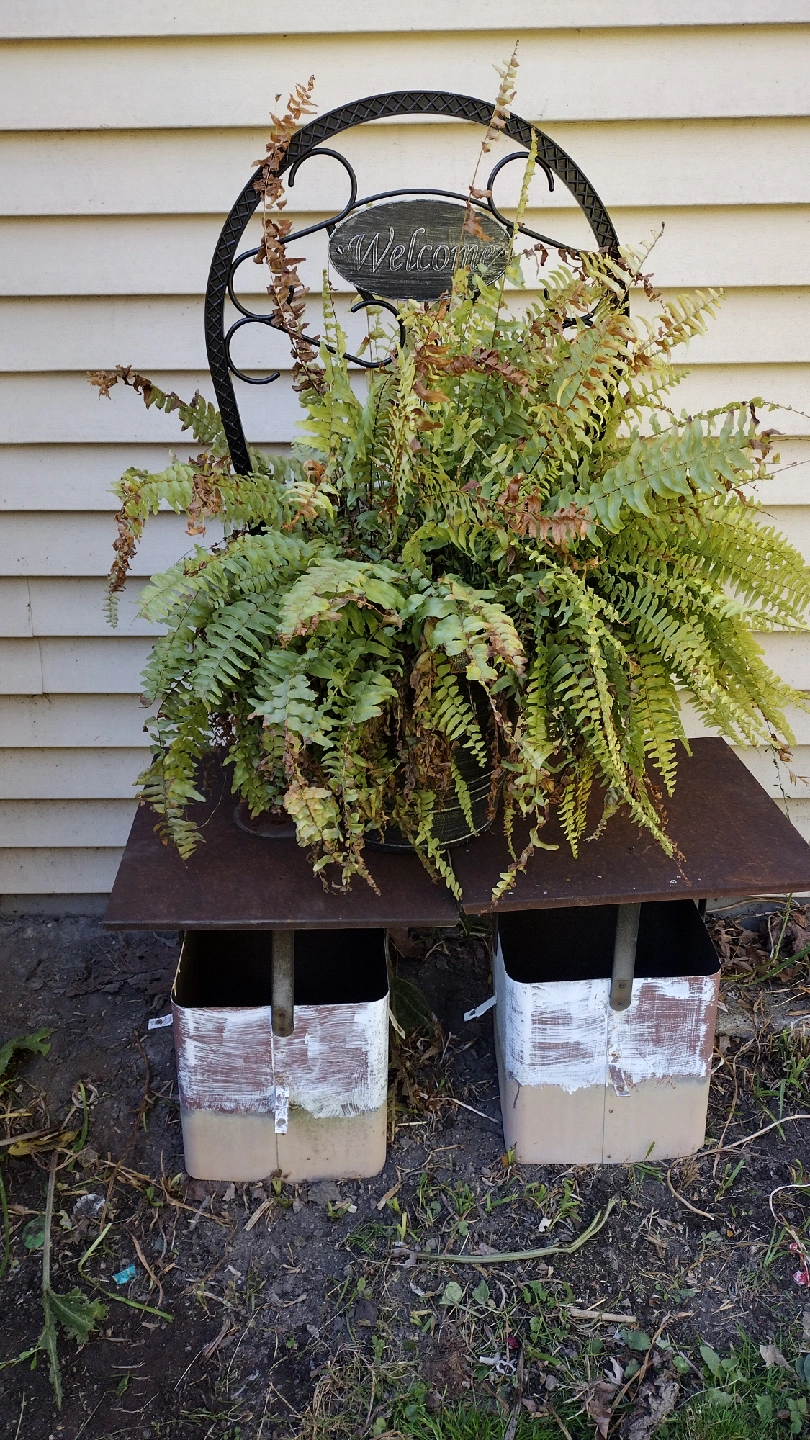 5I'm selling a potted Boston fern with a decorative metal welcome sign. It's a charming addition to any porch or garden! The fern is lush and green, perfect for adding a touch of nature to your space