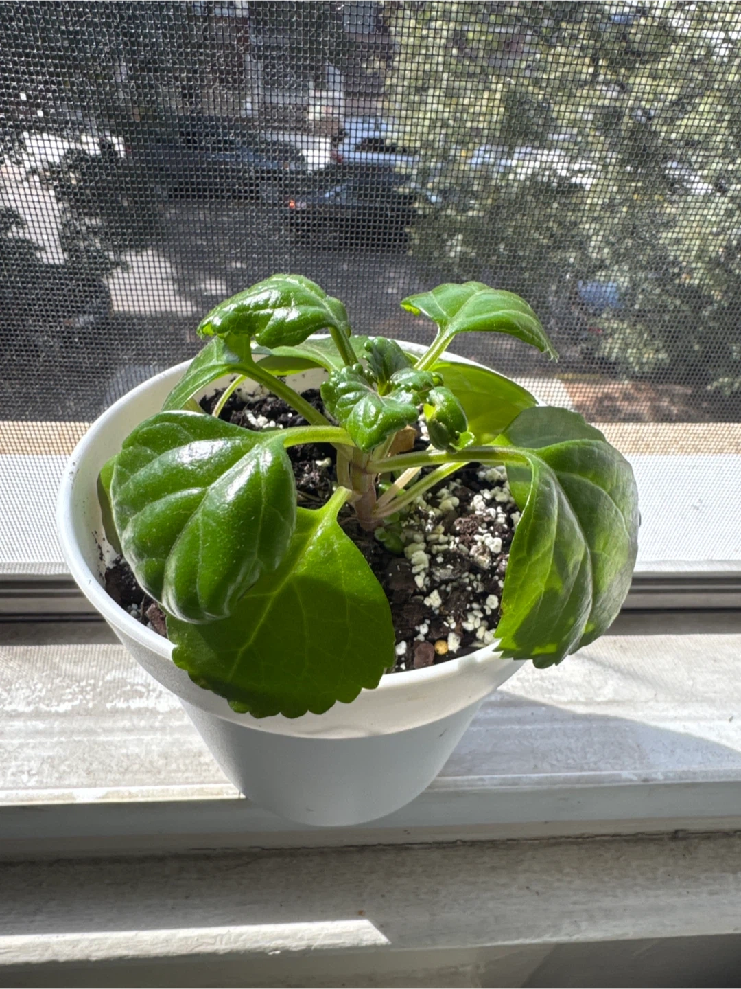 Here's a cute little potted plant! The leaves are a vibrant green, and it's in a simple white pot. It would be a great addition to any sunny windowsill or desk