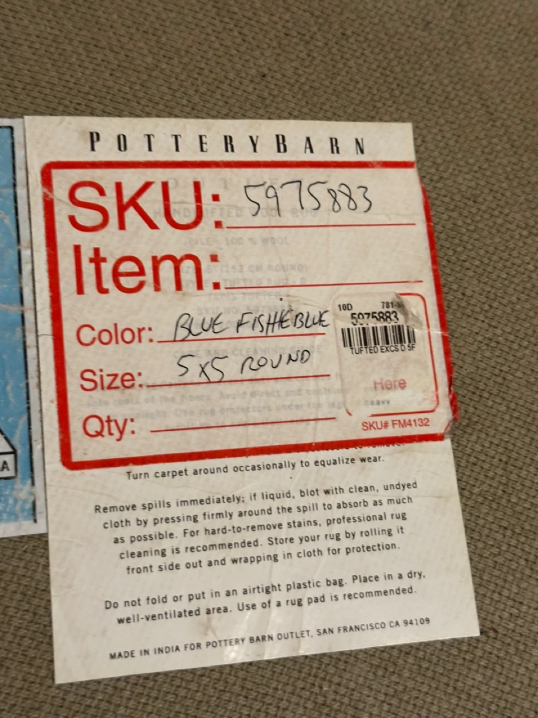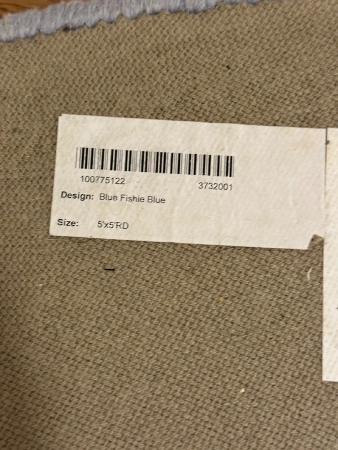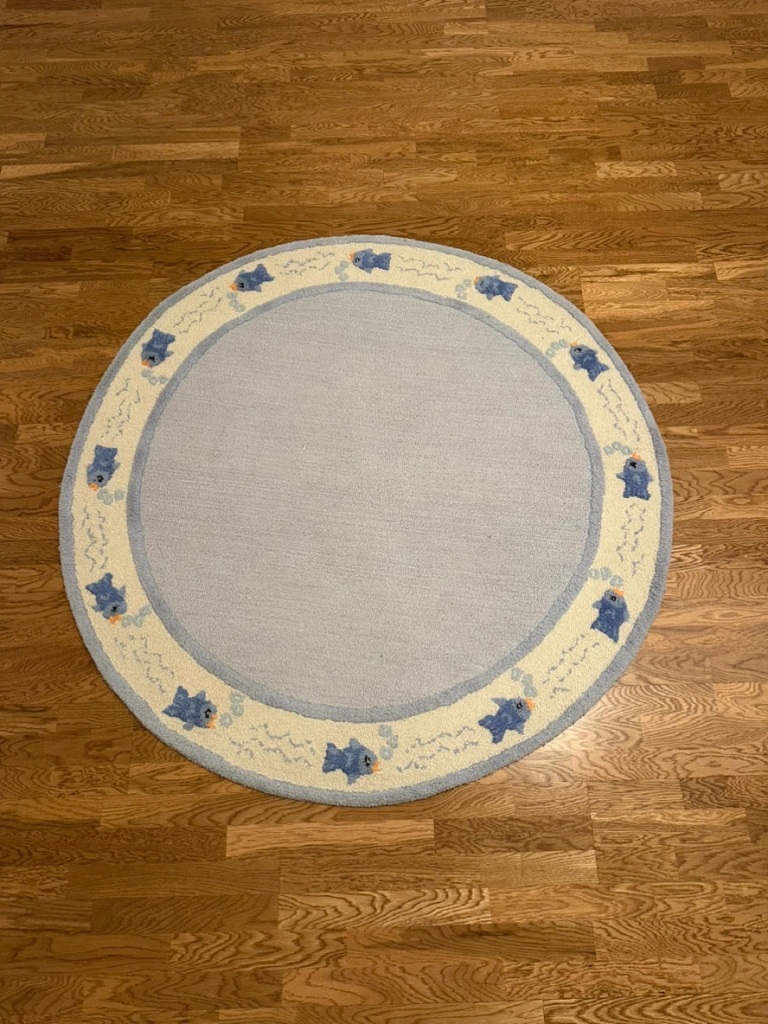 Selling a Pottery Barn rug with a cute fish design! The rug is round and measures 5x5 feet. It's a 'Blue Fishie Blue' and would be perfect for a kid's room.