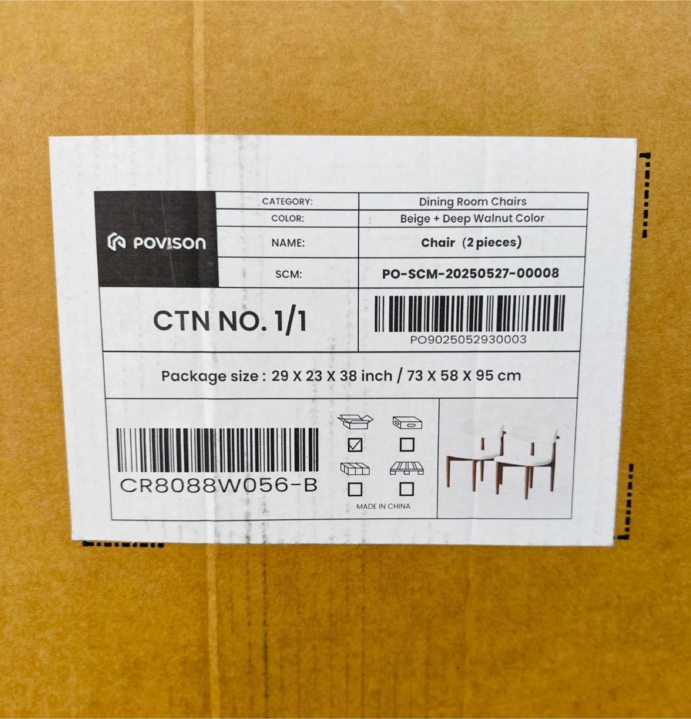 This Povison dining room chair is in beige and deep walnut color. It comes in its original packaging, with a package size of 29 x 23 x 38 inches / 73 x 58 x 95 cm I have 2 sets. Each set is $400