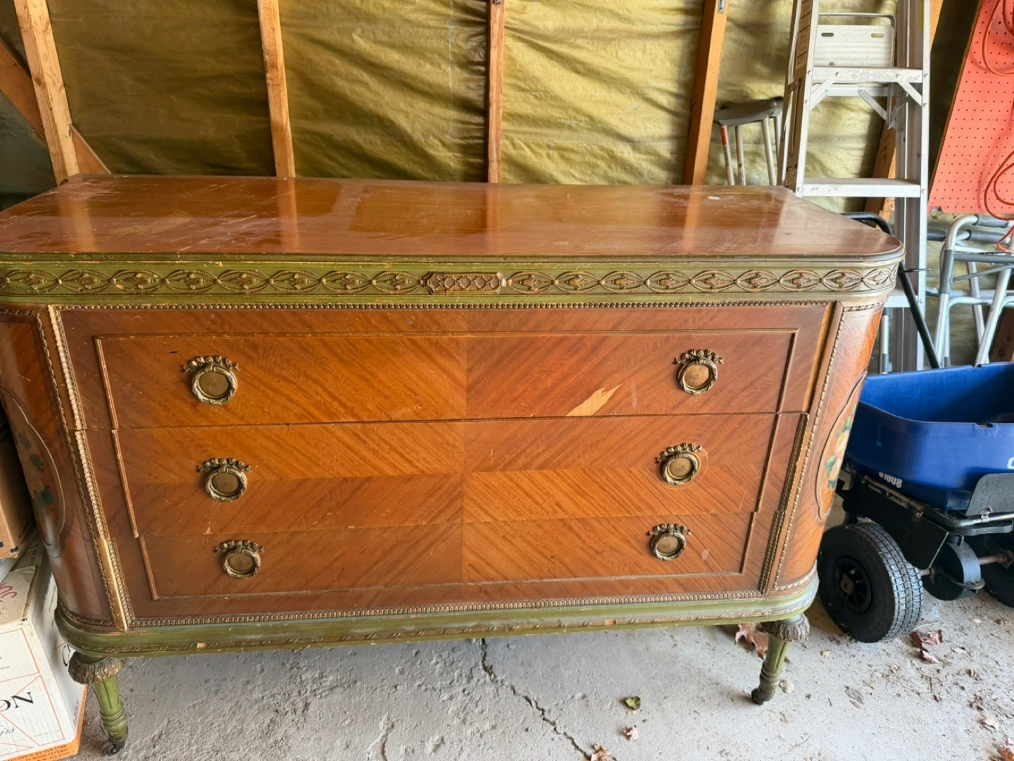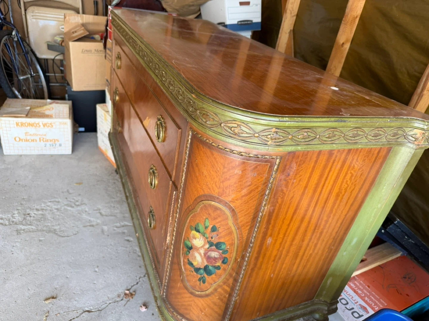 This vintage dresser features a wood grain finish and decorative painted floral accents. It has a detailed metallic trim and three drawers with brass hardware. It's a charming piece for a bedroom or entryway. The dresser needs some repair. The legs are a little wobbly. It only needs some work to it, but otherwise it’s in pretty good condition.