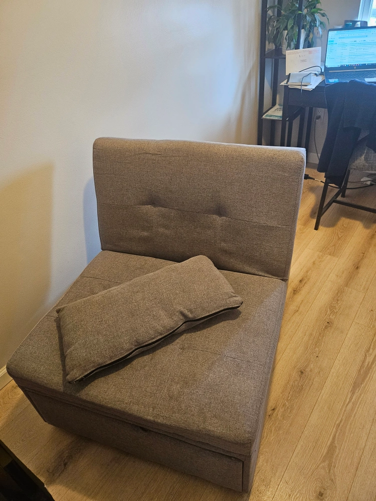 This convertible chaise lounge, in a neutral gray color, offers versatile seating options. It features a headrest, a small bolster pillow, and an ottoman that can be used as a footrest or a separate seat. The ottoman can be stored inside the chaise lounge. This is a perfect piece for relaxing and enjoying your favorite book.
