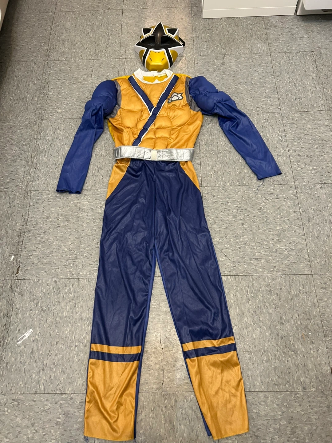 Power Rangers costume in blue and yellow! It appears to be in good condition and comes with a mask, it is very soft and comfortable material