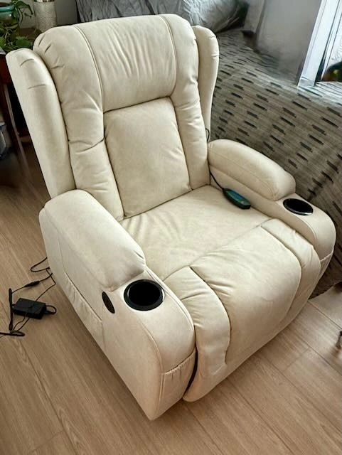 Electric power lift and recliner chair with massage and heat. Easy to reach side button to adjust back and legs w/ 3 Positions. Remote control for heat and massage. Includes USB Port for charging, cupholders, and side pockets for storage. Material: PU Leather/Beige Brand: Best Choice Products PU Brand new. Purchase on Amazon for $399 +tax. Doesn't fit our home.