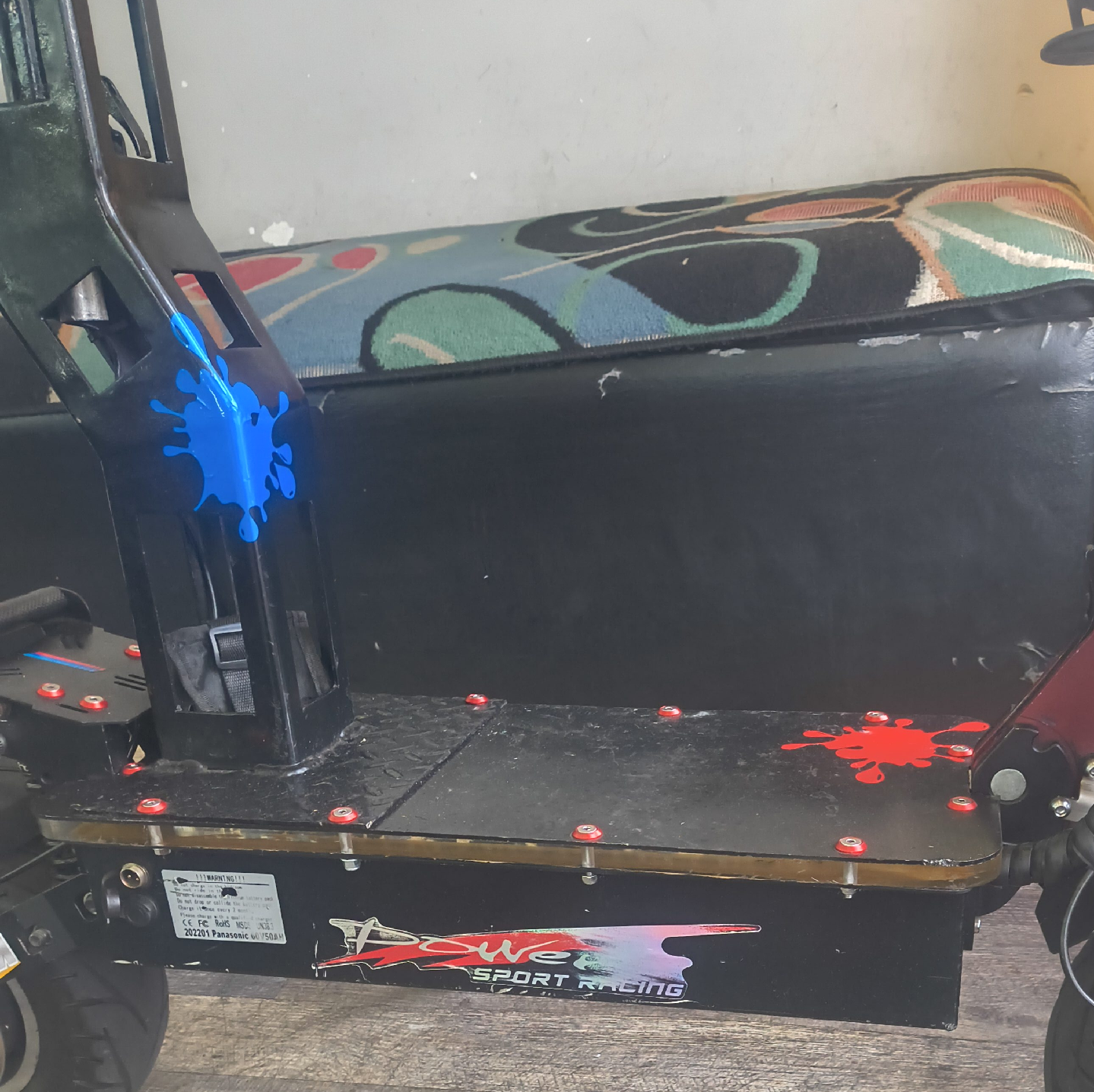 Selling a Power Sport Racing electric scooter. It looks like it has a Panasonic 60/50AH battery. It has a black frame with red and blue accents. The manufacturing date is 2022 January 01