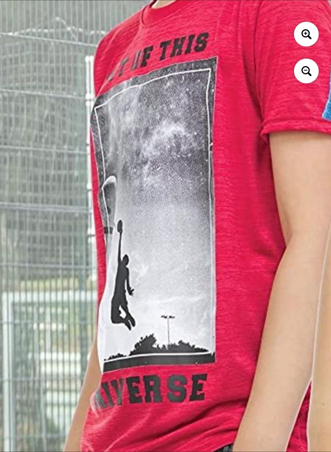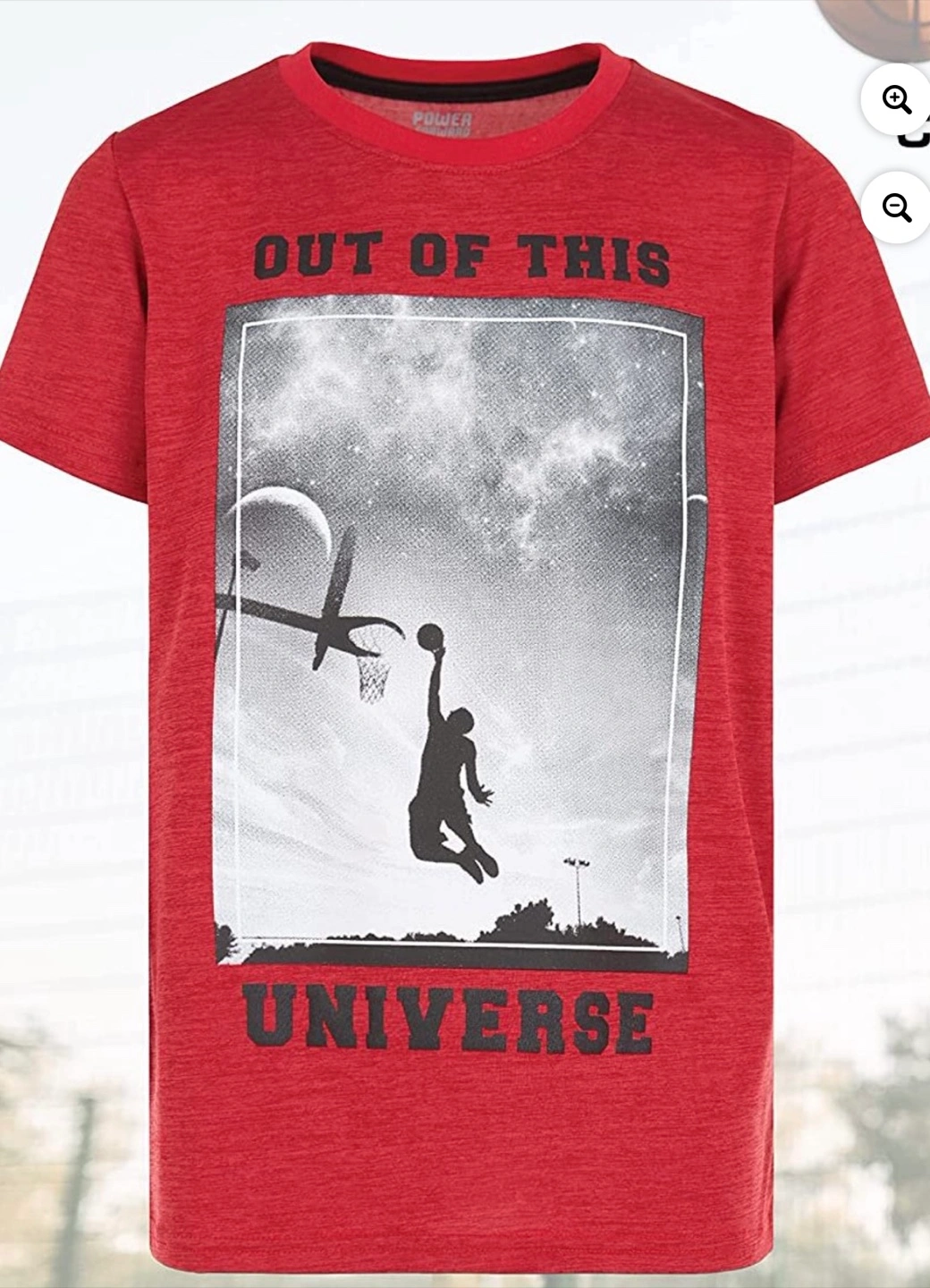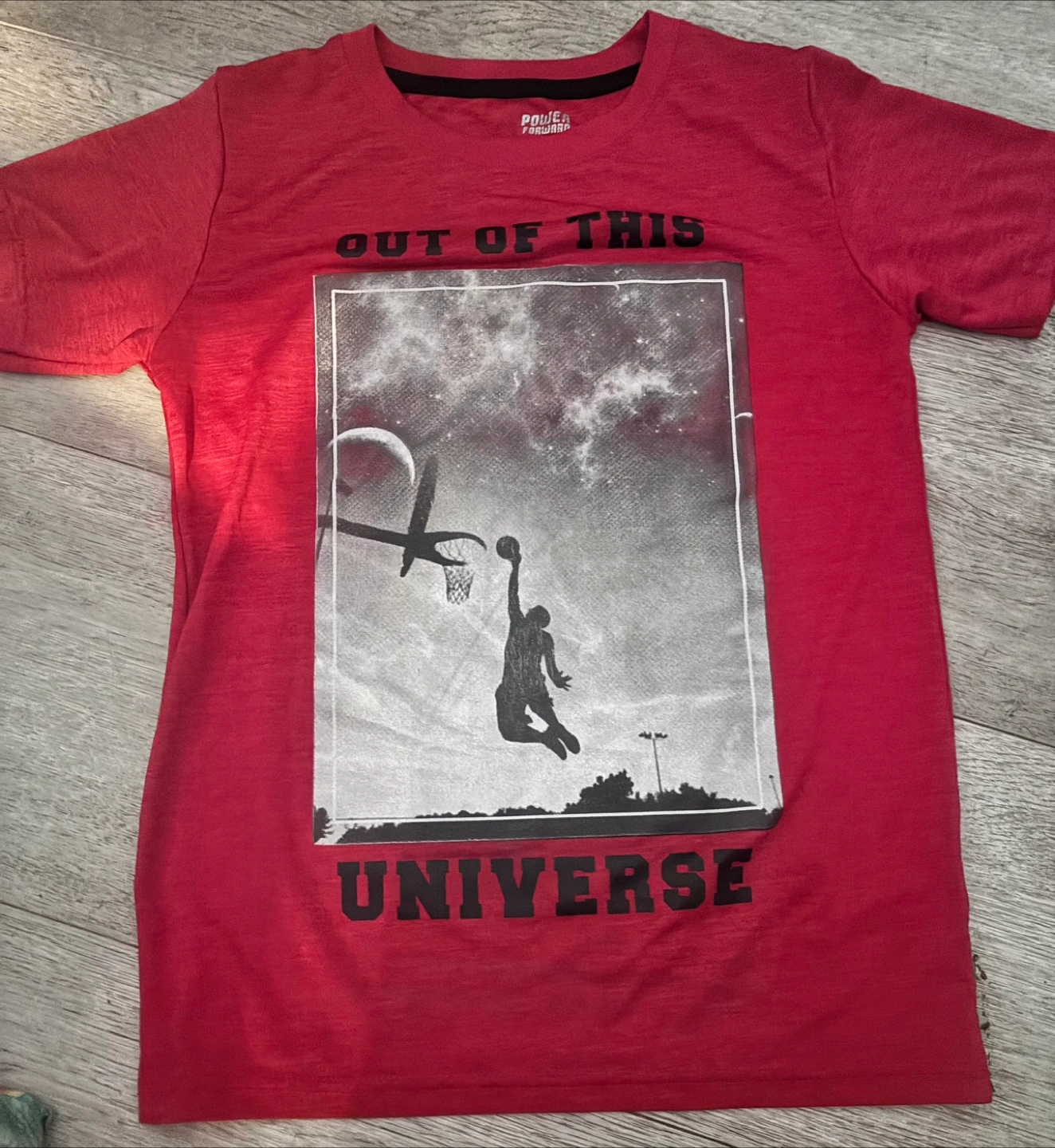 47This is a boy's graphic t-shirt by Power Squad. The shirt is red and features a graphic of a basketball player with the words "Out of This Universe". It's super comfortable, machine washable, quick dry, and durable!